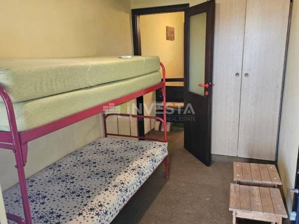 Le scale portano al piano superiore, dove si trovano due camere per bambini con letti a castello. Una delle camere ha l'accesso a una terrazza privata più piccola, mentre al piano superiore si trova anche un ulteriore bagno con doccia. La casa è posizionata tra altre case a schiera, con una disposizione spaziale particolare e allungata. È dotata di aria condizionata e viene venduta con l'arredamento esistente, più vecchio ma ben conservato e funzionale, risalente al 1990.