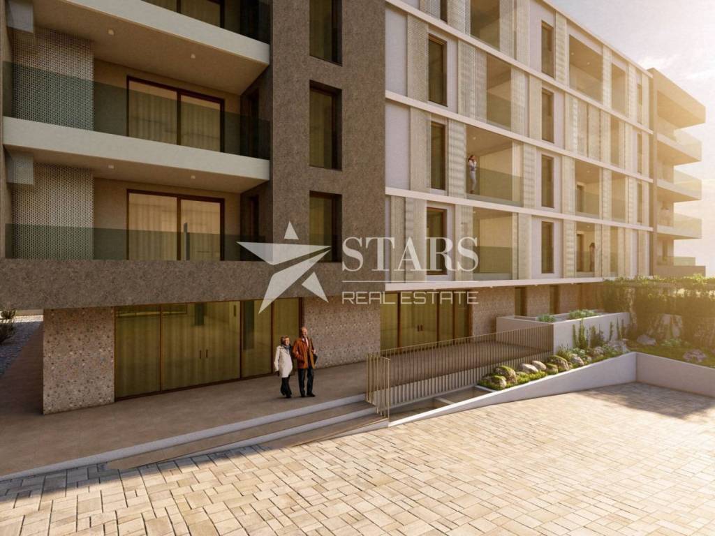 The building consists of 40 apartments and 4 commercial spaces, spread over 5 floors, with an underground garage and green areas.