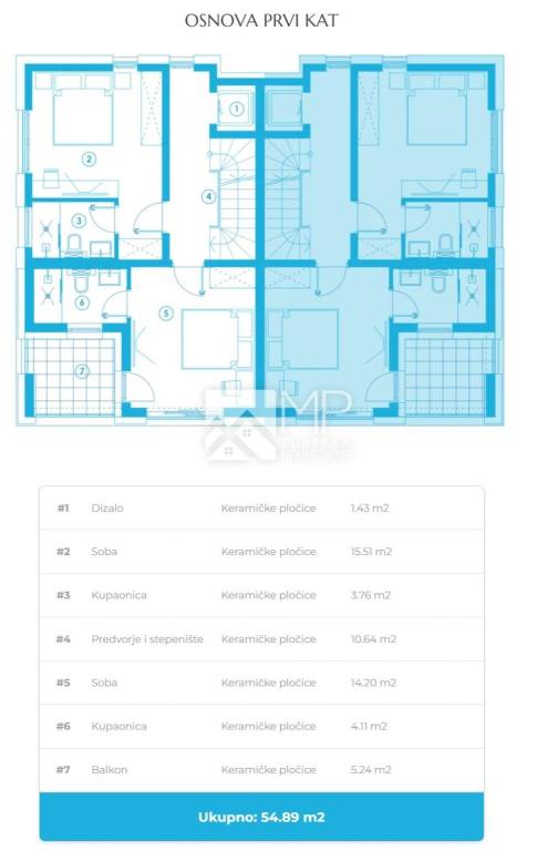 First floor – 54.89 m2 - The first floor offers two spacious bedrooms, each with its own bathroom, and a balcony. The floor is connected by an elevator and a staircase, providing comfort and convenience in everyday use.