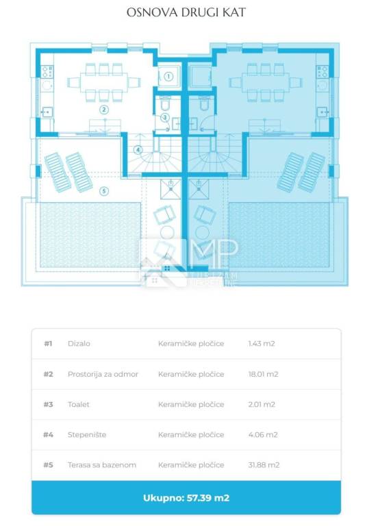 Second floor – 57.39 m2 - The second floor offers a relaxation area, a toilet and a spacious terrace with a private pool (31.88 m²), perfect for panoramic enjoyment and relaxation. The floor is connected by an elevator and a staircase, providing luxury and convenience on each floor.