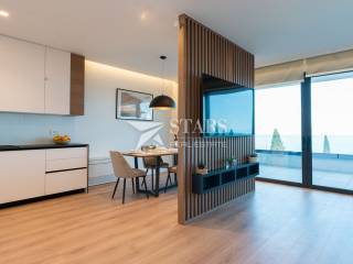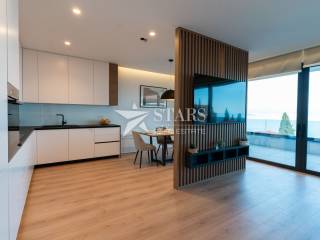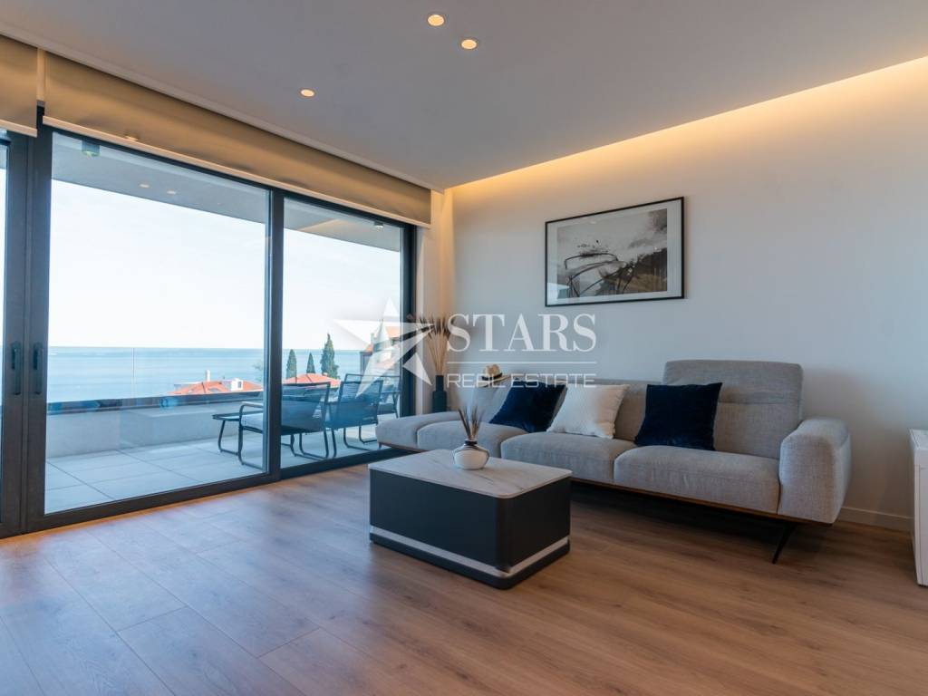 A luxuriously furnished and fully equipped apartment is available for long-term rent. Located on the first floor of a modern building with an elevator, right in the center of Opatija, just 250 meters from the sea. The apartment has 100 m² of living space and consists of two spacious bedrooms, two bathrooms, a hallway, and an open-plan living room with kitchen and dining area. The living room opens onto a large terrace with a beautiful view of the Kvarner Bay.