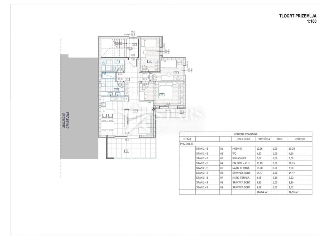 The total floor area including annexes is 104.54 m², and the calculated usable area (with coefficients) is 94.51 m².