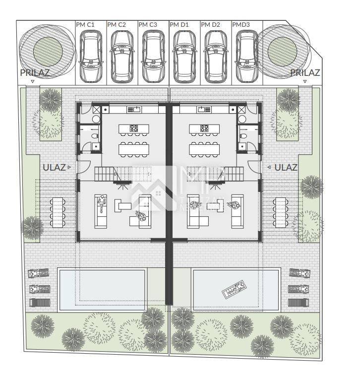 In the garden in front of the house, a place for a swimming pool with a sunbathing area has been designed. 3 parking spaces are provided next to the house.