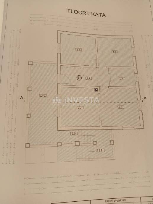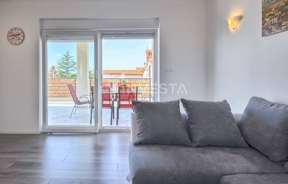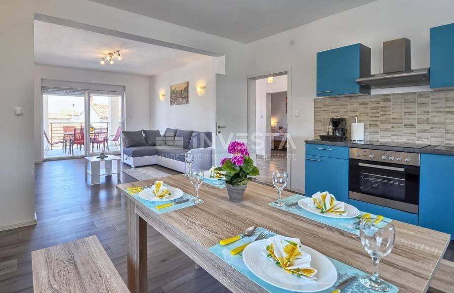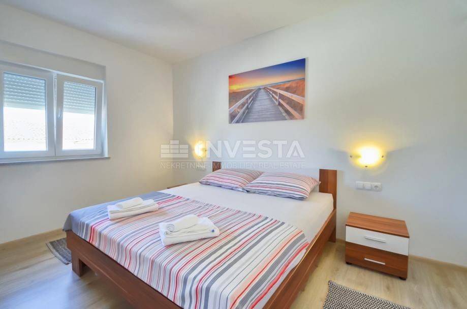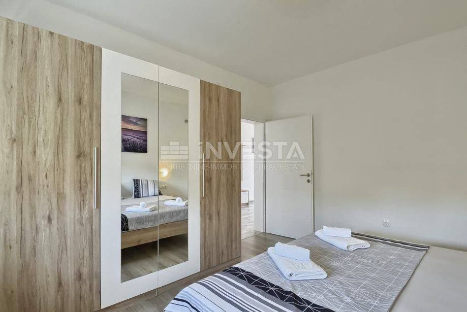 L'appartamento è su due livelli e consiste in un primo piano e un attico. L'appartamento al primo piano, con una superficie abitativa di 150 m², è composto da 2 grandi camere da letto, un ampio corridoio, un bagno, una grande terrazza e una cucina open space con soggiorno. Nell'attico ci sono altre 2 ampie camere da letto, di cui una può essere una camera da letto e l'altra un soggiorno con vista come desiderato dal futuro proprietario. C'è anche un WC per gli ospiti nell'attico. Dall'attico si può godere della vista sul mare e sull'arcipelago di Medulin. L'appartamento include anche un edificio separato utilizzato come garage con una superficie totale di 93 m² e un totale di 177 m² di giardino privato.