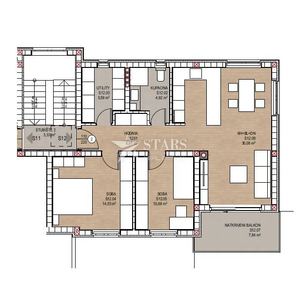 Apartment S12 is a two-bedroom apartment with a living room, located on the second floor, with triple orientation.