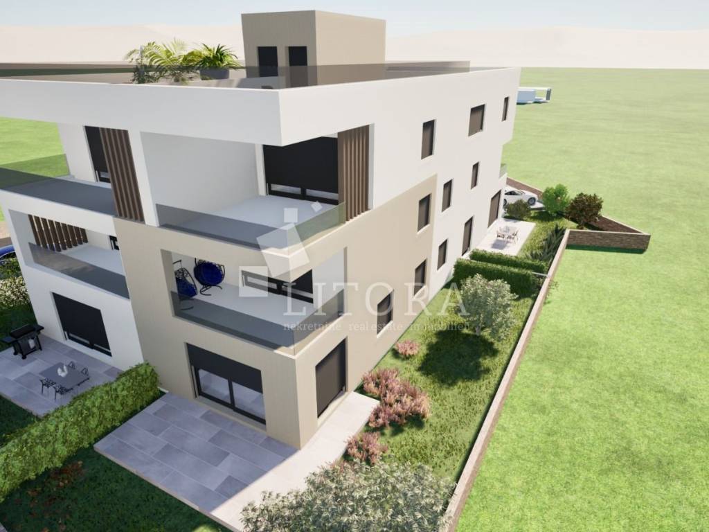 opening onto a large covered terrace of 17,02 m². The apartment has one parking place. Features and Equipment: high-quality ceramics, modern sanitary ware, quality carpentry, underfloor heating in bathrooms, air conditioning in all rooms, mosquito nets. Distance to the centre is 950 m, to the sea / beach is 50 m.