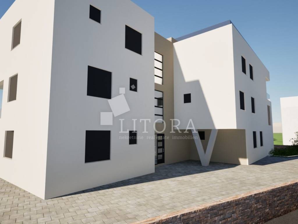 A comfortable apartment located ion the 1st floor of a residential building, just 50 meters from the beach. The apartment is south-facing and has a total usable area of 81,03 m2 and consists of: a hallway, two bedrooms ( one of them with own bathroom), bathroom, a spacious living room with a kitchen and dining area, opening onto a large covered terrace of 16,12 m²with sea view. The apartment has one parking place. Features and Equipment: high-quality ceramics, modern sanitary ware, quality carpentry, underfloor heating in bathrooms, air conditioning in all rooms, mosquito nets. Distance to the centre is 950 m, to the sea / beach is 50 m.