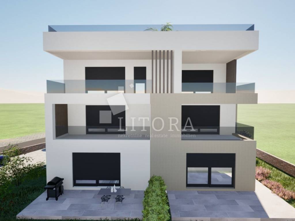 A comfortable apartment located on the 2nd floor + rooftop terrace of a residential building, just 50 meters from the beach. The apartment is south-facing and has a total usable area of 128,68 m2 and consists of: a hallway, two bedrooms, 3 bathrooms, a spacious living room with a kitchen and dining area, opening onto a large covered terrace of 21,45 m². Internal stairs lead to rooftop terrace size 108,52 m2. The apartment has one parking place. Features and Equipment: high-quality ceramics, modern sanitary ware, quality carpentry, underfloor heating in bathrooms, air conditioning in all rooms, mosquito nets. Distance to the centre is 950 m, to the sea / beach is 50 m.