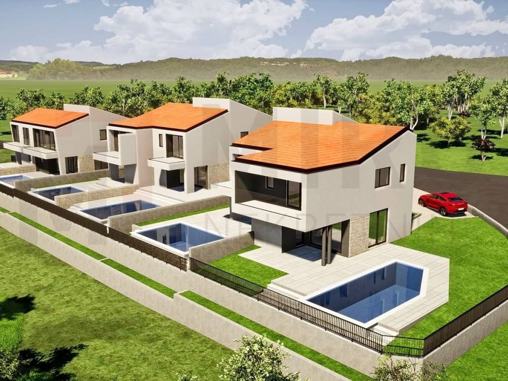 Island of Krk, Malinska, newly built, semi-detached house with sea view and swimming pool. The property has an area of 121.72 m² + 61.02 m² basement, ground floor and first floor. On the ground floor there is an entrance hall, a bathroom, a living room with a kitchen and a dining room, a storage room under the stairs and a covered terrace of 30 m². On the first floor there is a hallway, a bathroom, three bedrooms, one of which has its own bathroom and exit to the balcony. The house will be equipped with an air conditioning system in all rooms, underfloor heating in the living room and kitchen, PVC joinery, high-quality floor and wall ceramic tiles. The environment itself will be beautifully decorated with Mediterranean plants. There are two parking spaces on the lot. The planned completion of the works is for 12/2024. The house is the property of a natural person and the transfer of its ownership is subject to real estate transfer tax in the amount of 3%. The seller guarantees proper ownership documents. Visit us and find the square footage of your home!