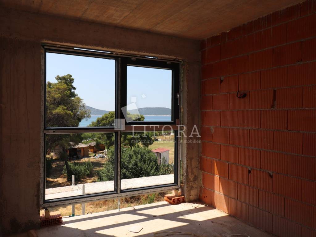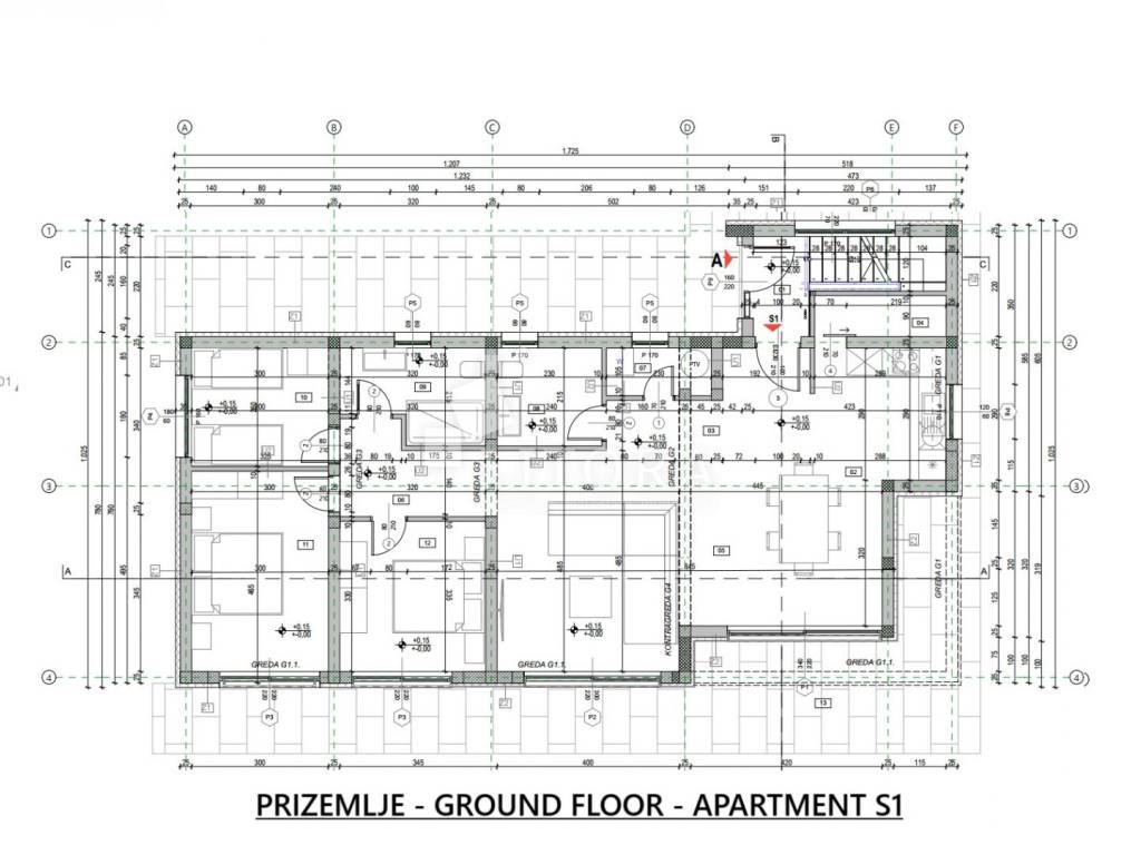 In Vodice, with a view of Plava Plaža beach, second row from the sea – new construction, a small luxury residential building with three identical, comfortable three-bedroom apartments. Apartment S1 is located on the ground floor and has a usable area of 123.41 m². It occupies the entire ground floor and consists of an entrance hall, kitchen with dining and living area, laundry room, guest toilet, bathroom, and three bedrooms. The apartment includes a large, partially covered terrace of 37.69 m², and a 100 m² garden adjacent to the terrace. It comes with a private parking space. The building will be equipped with heat pumps, underfloor heating throughout the apartment, external electric blinds, high-quality aluminum joinery, and DAIKIN air conditioning units in every room.