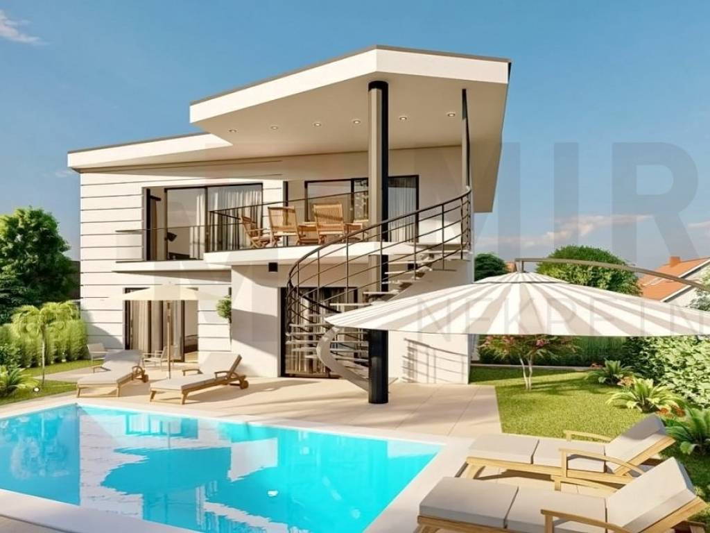 Island of Krk, Malinska, modern, new semi-detached house in an attractive location 150 m from the sea. The house has a basement, ground floor and first floor with a total net area of 197m2. In the basement there is 1 bedroom with a bathroom, a toilet, a technical room and a laundry room. An internal staircase leads to the ground floor of the house, which consists of an entrance hall, 2 bedrooms, each with its own bathroom and access to the terrace, and a garden with a swimming pool and sun deck. Internal and external stairs lead to the first floor of the house. On the first floor of the house there is a guest toilet, a spacious living room, kitchen and dining room, with access to a covered terrace. The property is decorated with a modern project, first-class Italian ceramics, German parquet, top-quality ALU carpentry, air conditioning in all rooms, underfloor heating with a heat pump system, automatic irrigation. The property will have preparation for an alarm system, cameras, smart system, and solar panels. Turnkey sales. The real estate is owned by a legal entity and the buyer is exempt from paying real estate sales tax. The seller of the house guarantees complete ownership documents and orderly transfer of the property. Visit us and find the square footage of your home! The planned move-in date is spring, 2024.