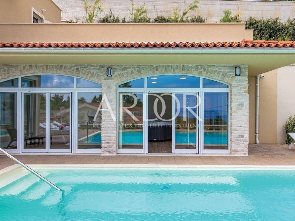 Su due piani lussuosamente attrezzati di circa 400 m2, ci sono 5 camere da letto con guardaroba privati, 5 bagni, ampio soggiorno con cucina e zona pranzo, palestra e sauna. Il piano terra occupa un soggiorno e sala da pranzo open space adatto alla socialità, dove nella parte centrale si trova un grande tavolo per dieci persone e un camino a legna. Grandi aperture vetrate collegano l'intero piano terra con terrazze e zone prendisole e una piscina riscaldata di 12x6 m.