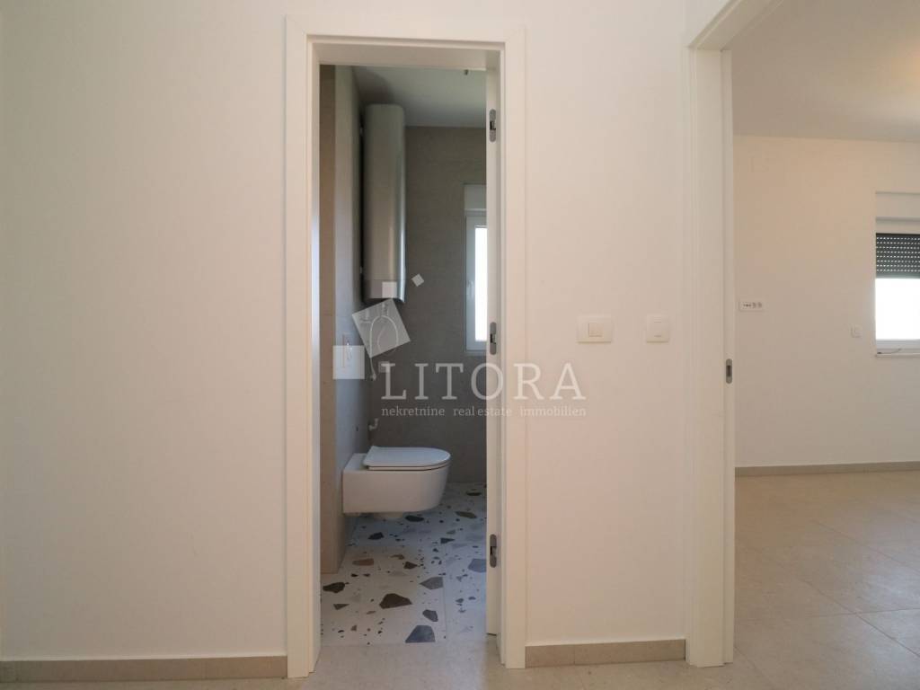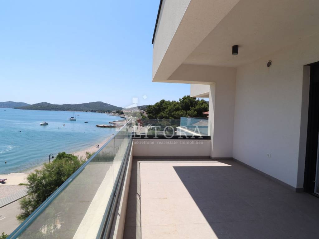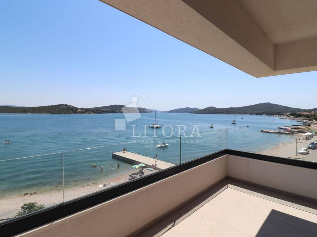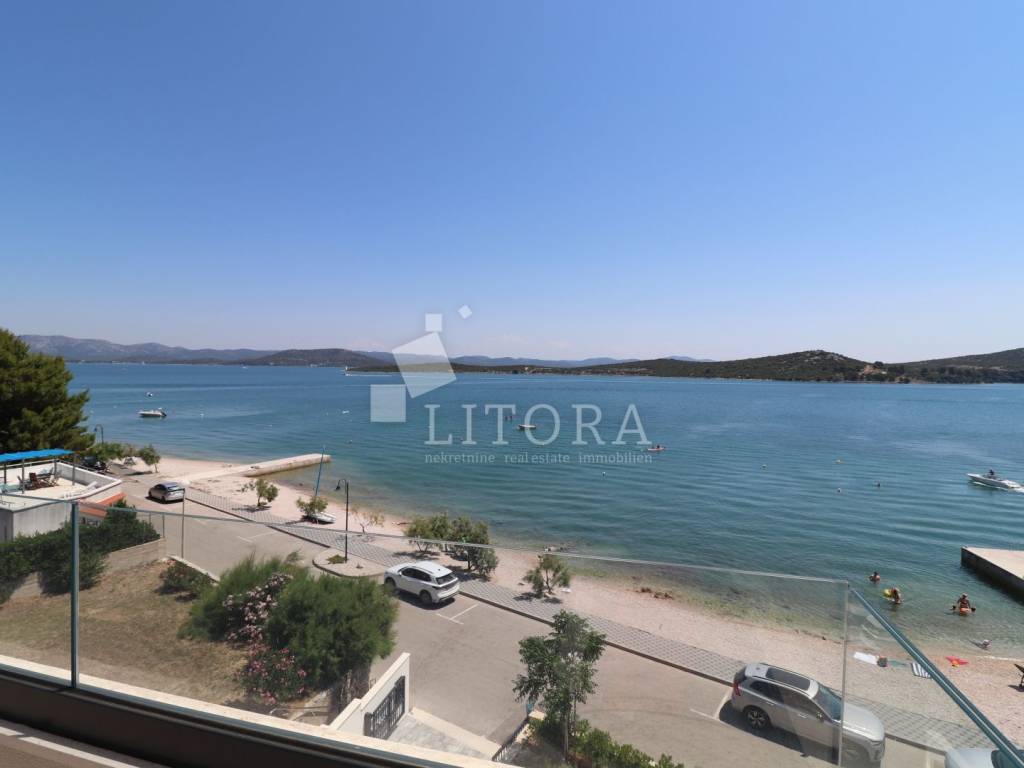 Betina – First row by the beach! Modern two-bedroom apartment on the 2nd floor of a new building in a prime location with open sea view. The apartment is facing east, offering a beautiful, unobstructed view of the sea. The total usable area is 84.86 m², and it consists of: entrance hallway, two bedrooms, bathroom and a separate guest toilet, fully equipped modern kitchen with dining area and living room, covered terrace of 13.50 m² with sea view, garage parking space (20 m²), storage room (5.34 m²). Additional amenities: The residents have access to a spacious shared courtyard of approx. 200 m², featuring a covered terrace, barbecue/outdoor kitchen, and an outdoor shower. High quality equipment includes: PVC windows with electric shutters and insect screens, Security and fire-resistant entrance door, Electric underfloor heating in the bathroom, hallway, kitchen, and living room, Air conditioning and TV connections in every room, Modern bathroom fixtures and sanitary ware. The apartment is fully finished and ready to move in, ideal as a holiday home, for year-round living, or for tourist rental.
