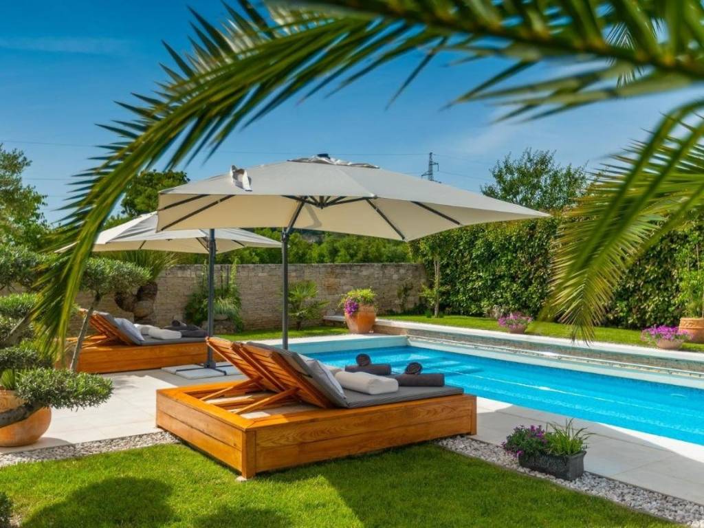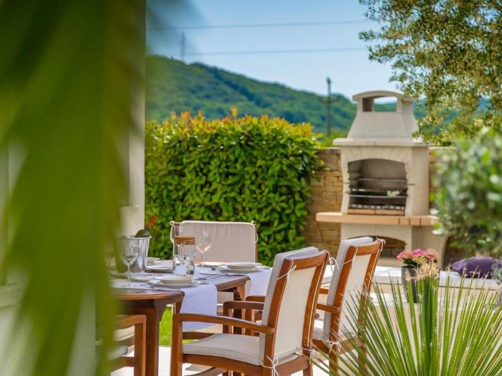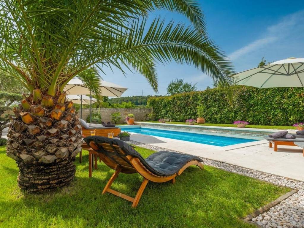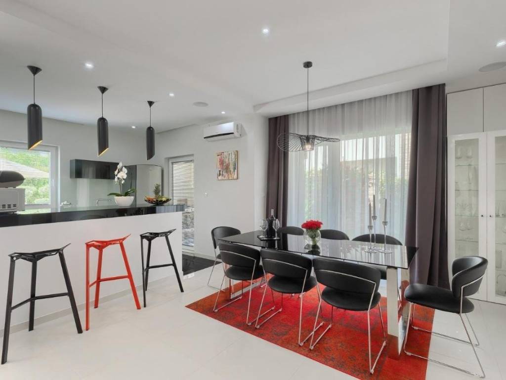 The entrance to the house is located on the ground floor, where through a corridor with storage you enter the open concept kitchen, dining room and living room with direct access to the outside part of the garden, terrace and swimming pool of 42 m2.