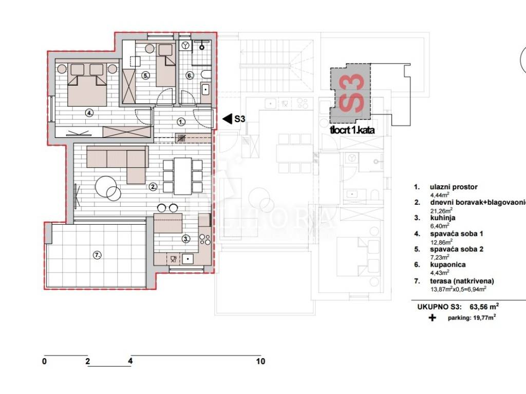 Primošten – Top-quality apartment with spacious terrace, and panoramic view. Situated in a peaceful, elevated location above Primošten, this modern apartment in the 1st floor of a new residential building offers a breathtaking panoramic view of the sea and the picturesque town. The building is designed to the highest contemporary living standards and positioned ideally – easily accessible by car, close to all public amenities, yet set back enough to provide privacy and tranquility. The apartment offers a total usable area of 73,45m² and is oriented to the southwest. It consists of an entrance hall, a modern bathroom, two comfortable bedrooms, and a spacious living area with access to a large terrace of 13,87m². Designed with a focus on quality and comfort, the apartment includes: underfloor heating, high-quality aluminum/PVC joinery with insect screens and electric roller shutters, premium ceramic tiles and first-class parquet flooring a garage parking space of 14,36 m² equipped with an electric vehicle charging station (already installed). The building is currently under construction, with completion and move-in expected by summer 2026. The distance to the nearest beach is approximately 1,250 m, and about 1,800 m to the center of Primošten.