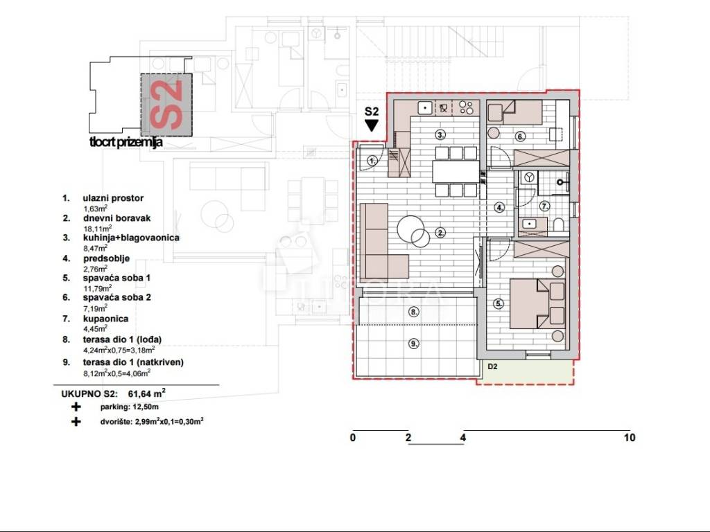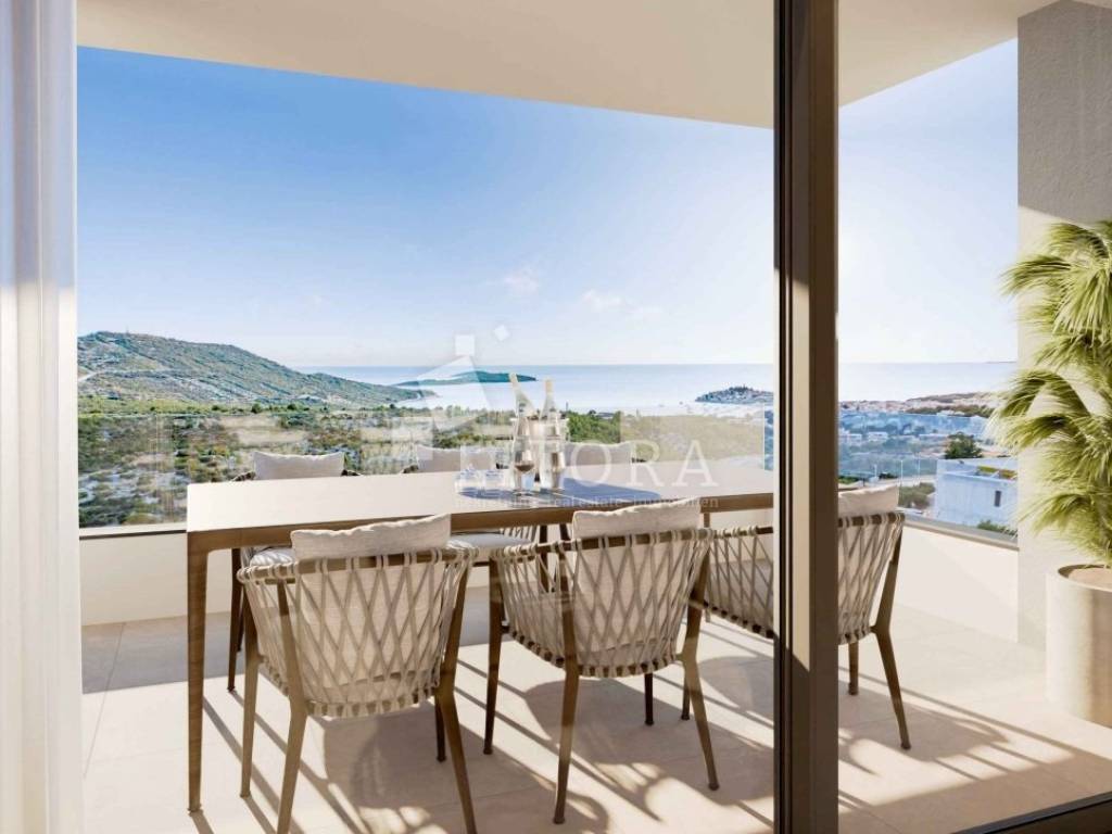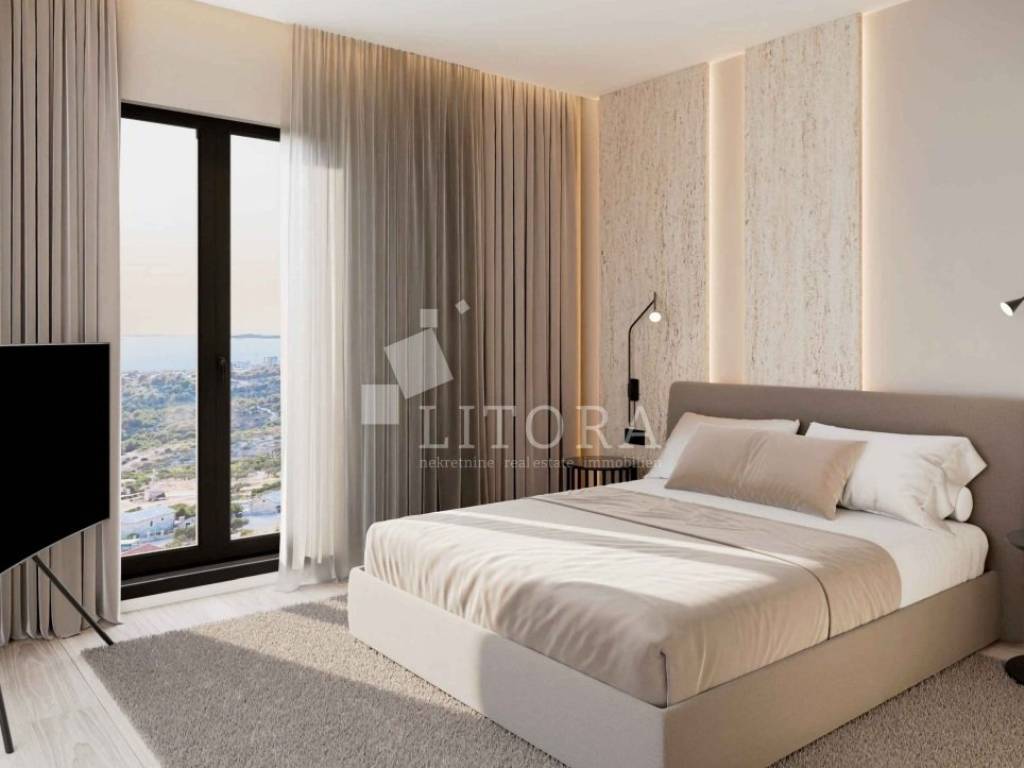 Primošten – Top-quality apartment with spacious terrace, and panoramic view. Situated in a peaceful, elevated location above Primošten, this modern apartment in the high ground floor of a new residential building offers a breathtaking panoramic view of the sea and the picturesque town. The building is designed to the highest contemporary living standards and positioned ideally – easily accessible by car, close to all public amenities, yet set back enough to provide privacy and tranquillity. The apartment offers a total usable area of 66,94m² and is oriented to the southeast. It consists of modern bathroom, two comfortable bedrooms, and a spacious living area with access to a large terrace of 12,34m² featuring and a private garden area of 2,99 m². Designed with a focus on quality and comfort, the apartment includes underfloor heating, high-quality aluminium/PVC joinery with insect screens and electric roller shutters, premium ceramic tiles and first-class parquet flooring a parking space of 12,50 m² equipped with an electric vehicle charging station (already installed). The building is currently under construction, with completion and move-in expected by summer 2026. The distance to the nearest beach is approximately 1,250 m, and about 1,800 m to the centre of Primošten.