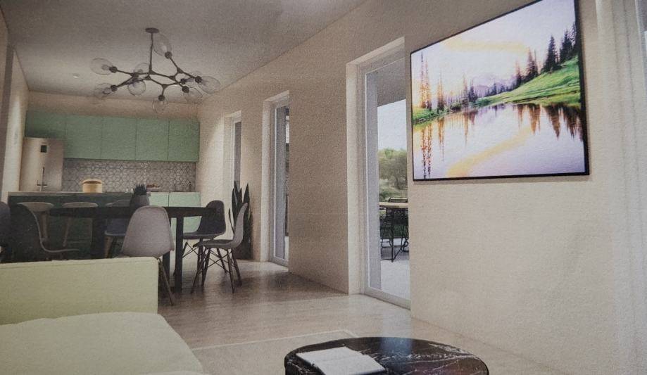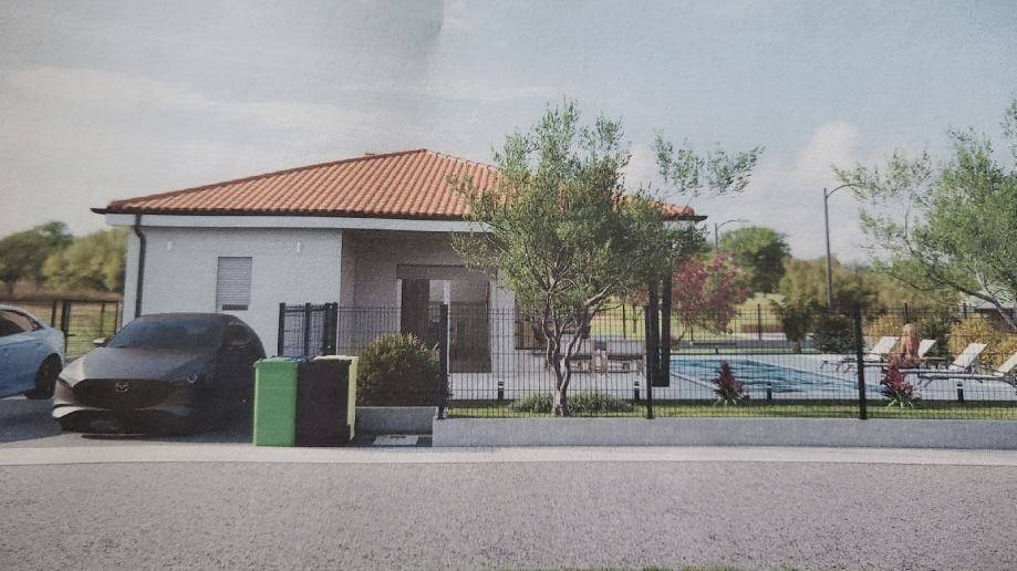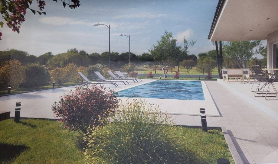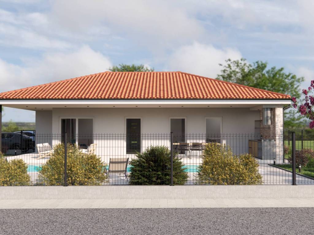 Detached house for sale in Žminj. The house is currently under construction and has a total of 135 m2. The house consists of a living room, a kitchen with a dining room, 2 bedrooms, 2 bathrooms and a toilet. The exit to the terrace offers a beautiful view of the spacious garden of 600m2 and the large swimming pool of 40m2. The issue of heating and cooling was solved by installing an air conditioner, a wood stove and underfloor heating. The location of this property is extremely favorable because it is located near all the necessary amenities for a comfortable life. 1/1 ownership, no encumbrances.