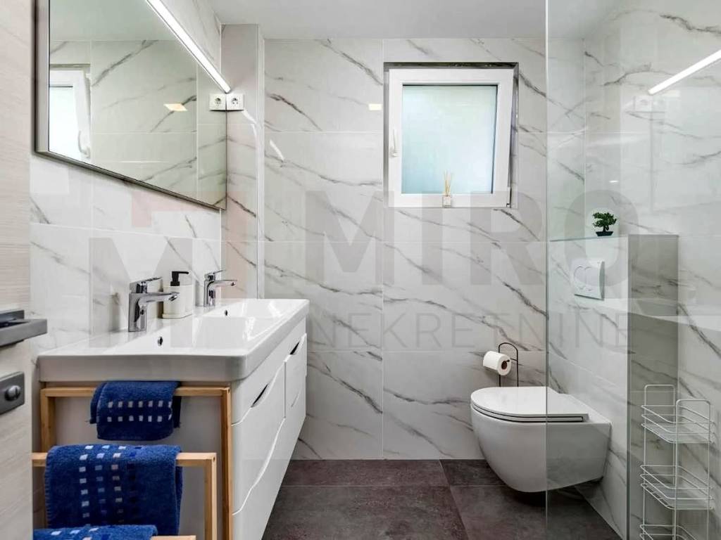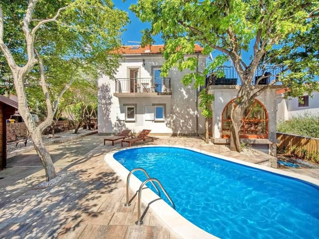 The island of Krk, Krk wider area, a detached house for sale with a swimming pool and a beautiful view of the sea, located in a quiet location. This spacious house was built on a plot of 550 m2, with a total living area of 170 m2. On the ground floor there are two bedrooms with access to the terrace, a bathroom and a living room connected to the kitchen and dining room. Internal stairs lead to the first floor where there are four bedrooms, two of which open onto a terrace with a view of the sea, and two onto a balcony. In the high attic there are two additional bedrooms and another bathroom. Beautifully landscaped garden with swimming pool, sunbathing area, covered terrace and garden house. The garage in the basement provides additional convenience. It is fully air-conditioned, equipped with quality carpentry and furnished. There are several parking spaces and a barbecue in the garden. The real estate is the property of a natural person and the buyer is obliged to pay real estate sales tax in the amount of 3%. The owner guarantees a quick transfer of ownership to the new buyer. Visit us and find the square footage of your home!