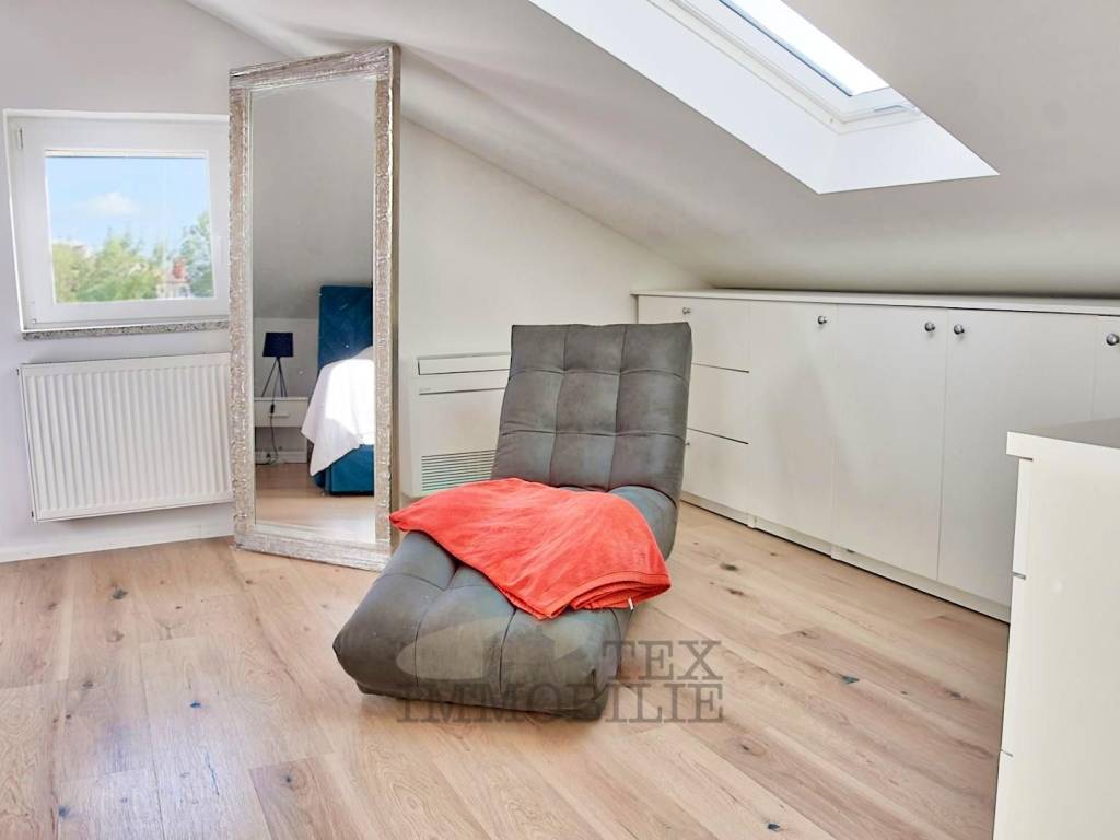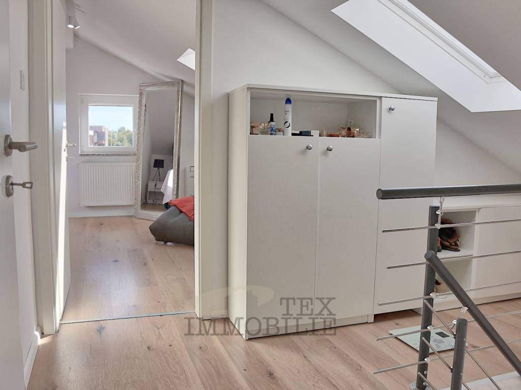 La scala interna conduce al secondo piano, dove si trovano altre due camere da letto e un ulteriore bagno. La camera matrimoniale è particolarmente spaziosa, con una superficie di 25 m², mentre la seconda camera, di 9,77 m², è stata convertita in una funzionale cabina armadio.