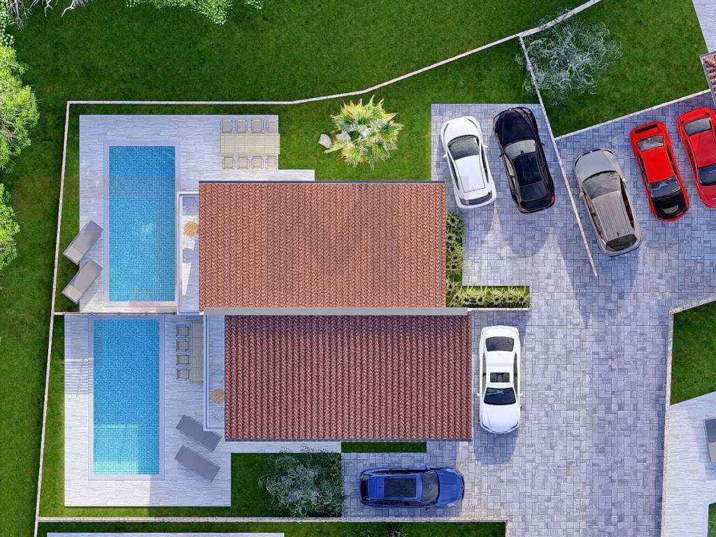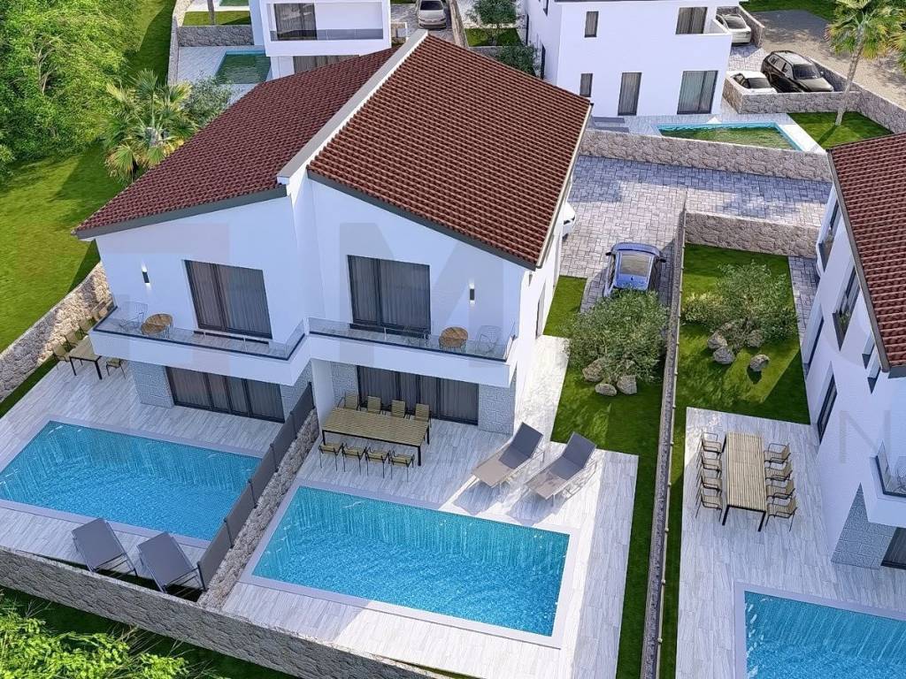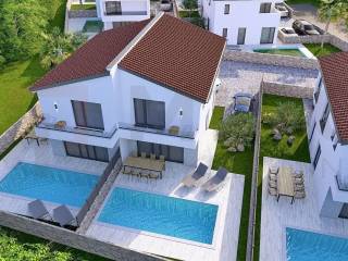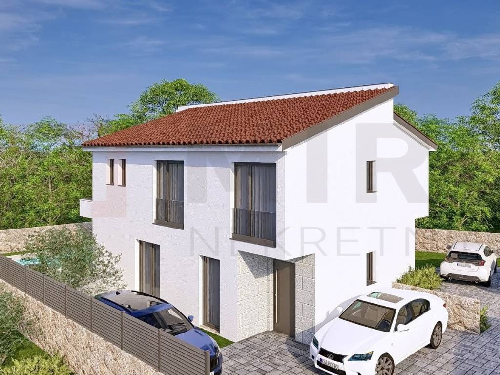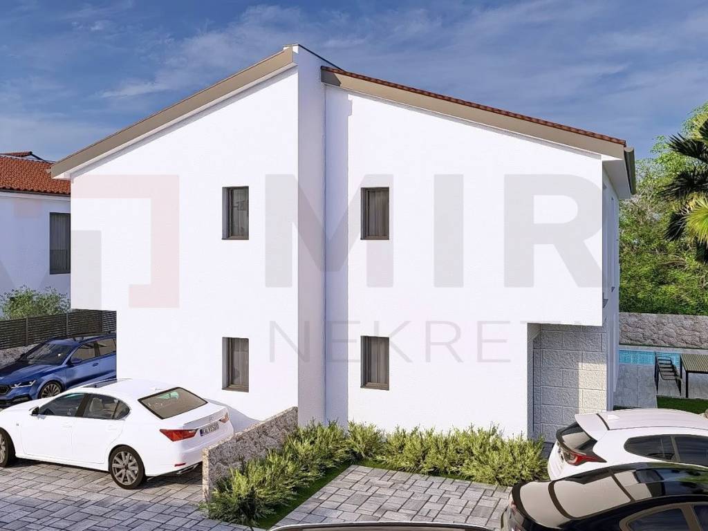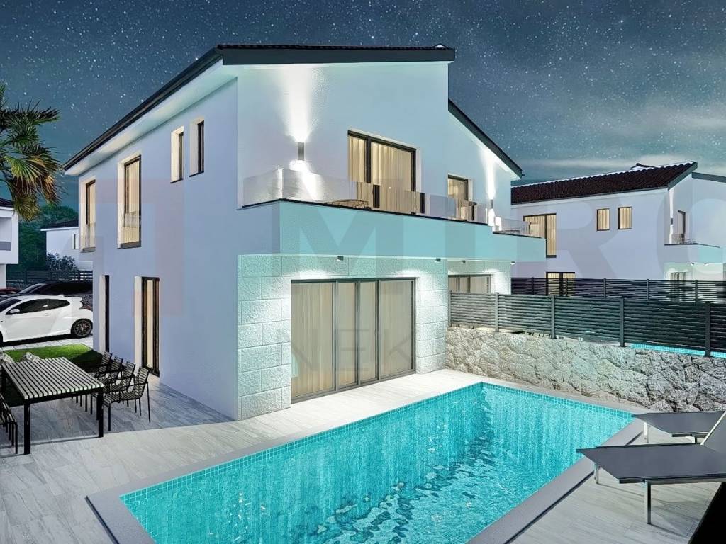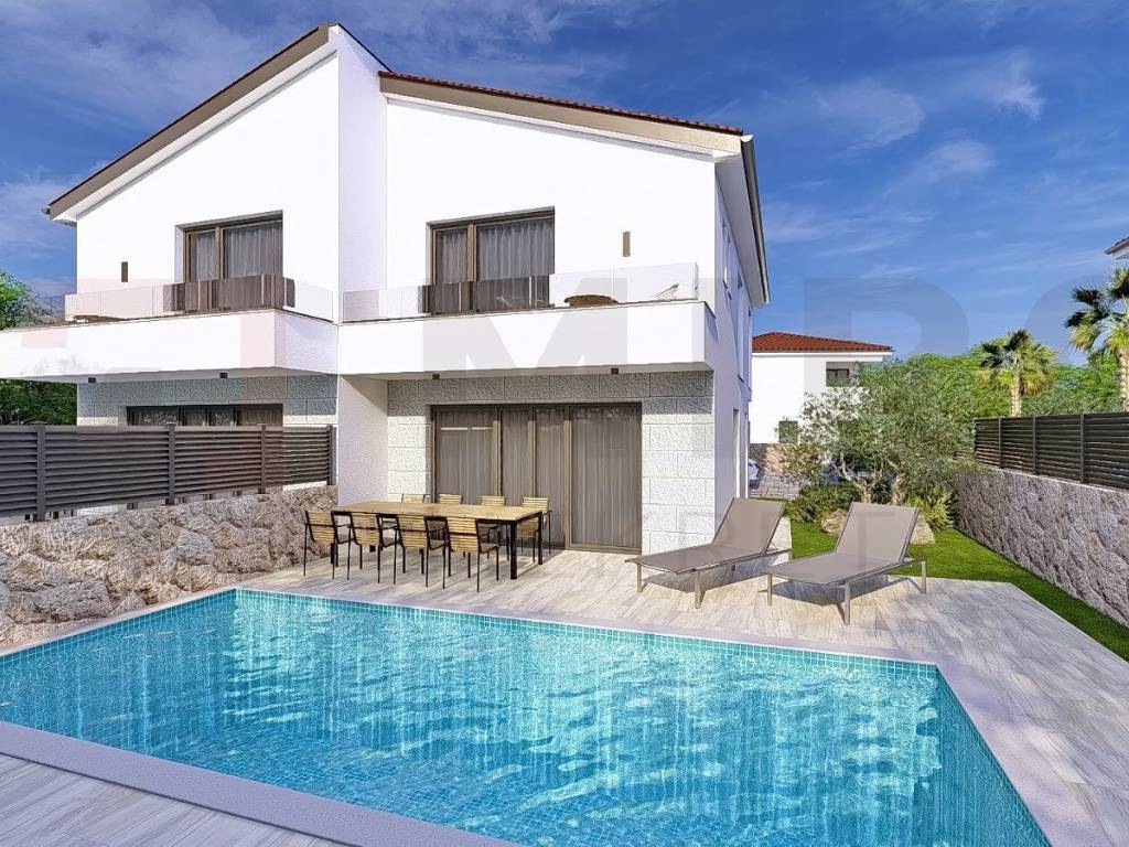Island of Krk, Malinska, a modern semi-detached house with a swimming pool and a beautiful sea view is for sale. The property is spread over two floors with a total area of 99.54 m2. On the ground floor there is a spacious living room connected to the kitchen and dining room, a toilet and a terrace leading to a landscaped courtyard with a swimming pool and a sunbathing area. On the first floor there are three bedrooms, each with its own bathroom, a hallway and a terrace with a sea view. The house stands out for its top quality construction and equipment. It includes underfloor heating with Wi-Fi control, air conditioning in all rooms and high-quality ceramics and sanitary ware. Each residential unit has two parking spaces. The completion of construction is planned for December 2025, and the property is being sold in a "turnkey" system. The house is owned by a physical obligation and is subject to a real estate transfer tax of 3% upon transfer of ownership. The seller guarantees proper ownership documents. Visit us and find the square footage of your home!