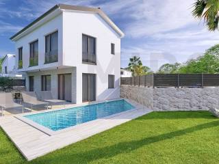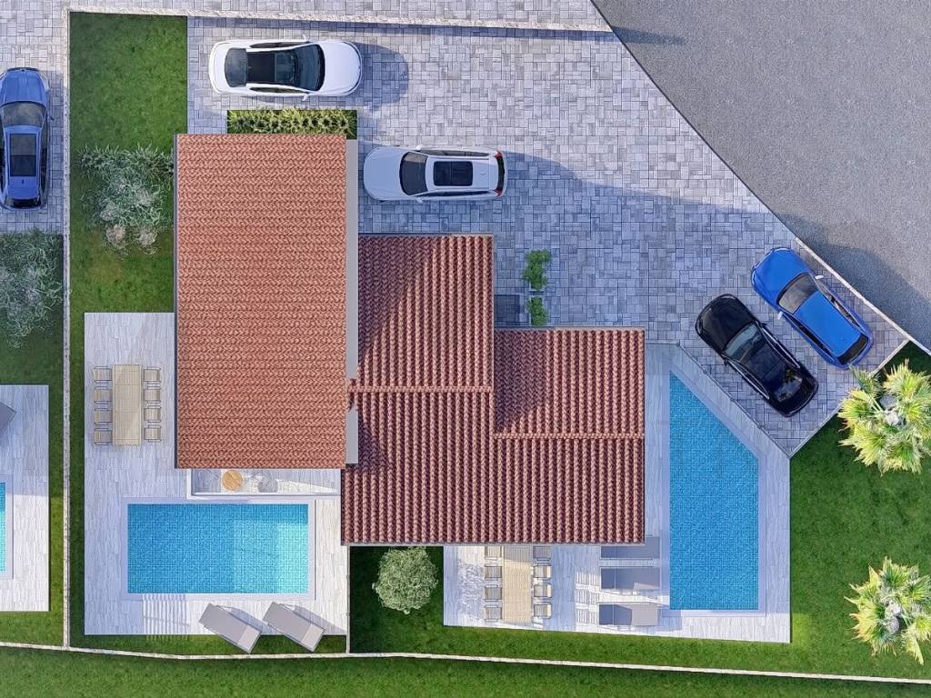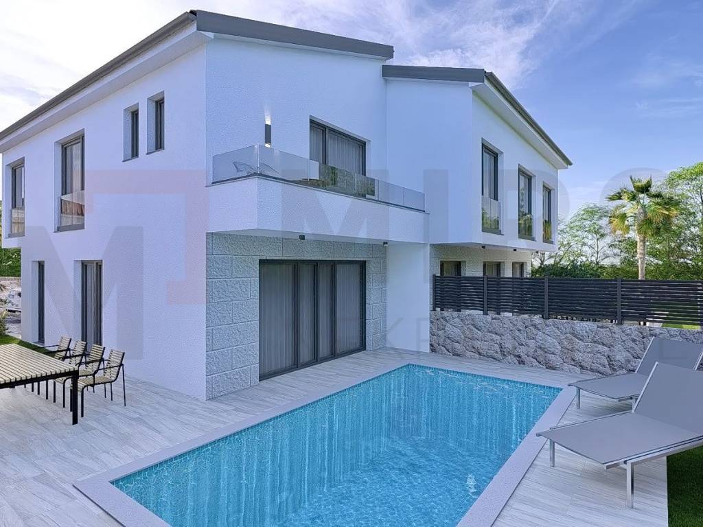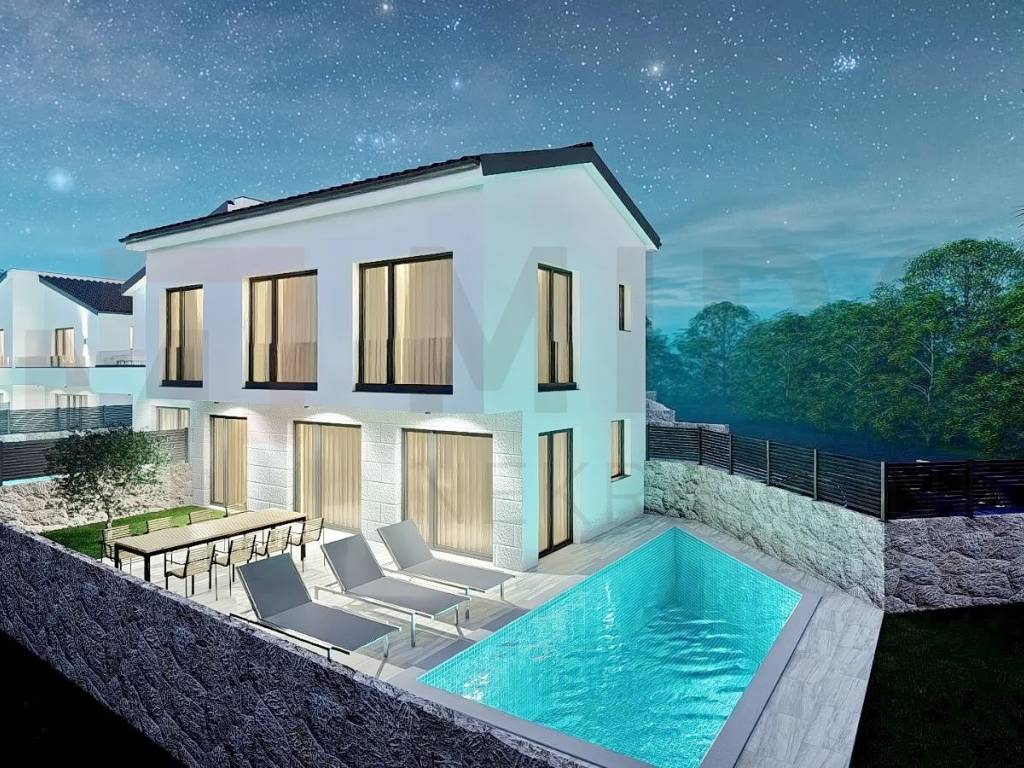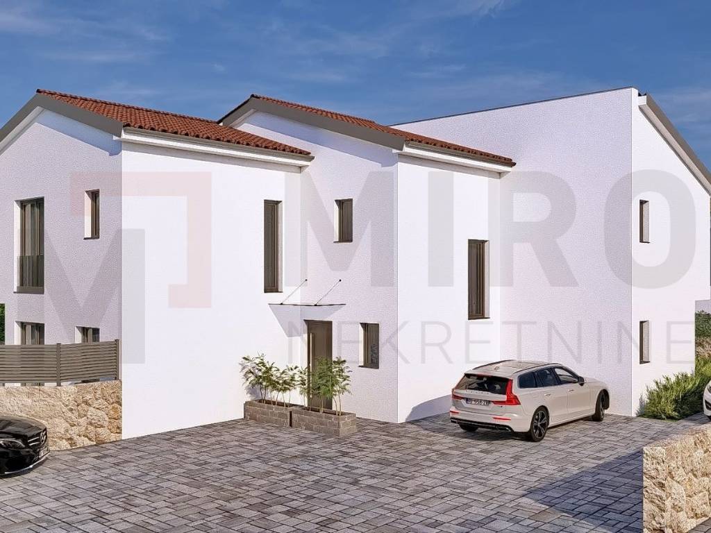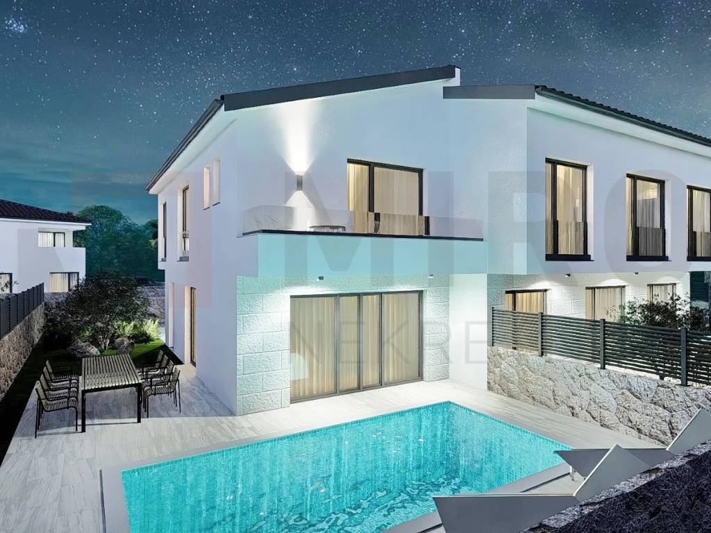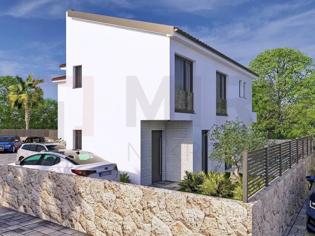 The island of Krk, Malinska is a new modern semi-detached house for sale in a prime location just 750 m from the sea and the beach. The house occupies 115.78 m2 of living space distributed over the ground floor and first floor, which are connected by internal stairs. The ground floor includes an entrance hall, toilet, kitchen with dining area and living room with access to a covered terrace and garden. On the first floor there is a hall, two bathrooms and three bedrooms with a beautiful sea view. On the beautifully landscaped garden of approximately 100 m2 there is a swimming pool with a sunbathing area and a machine room with space for pool equipment. It is worth noting additional features, quality materials and equipment that include floor coverings made of top-quality ceramics, quality sanitary ware, multisplit air conditioning in all rooms, electric underfloor heating, built-in high-quality PVC exterior joinery with electric shutters, security doors and a facade with insulation. It also has two parking spaces at the entrance to the yard. The property is currently under construction, with planned completion expected by the end of 2025. The house is owned by a physical obligation and is subject to a 3% real estate transfer tax upon transfer of ownership. The seller guarantees proper ownership documents. Visit us and find the square footage of your home!