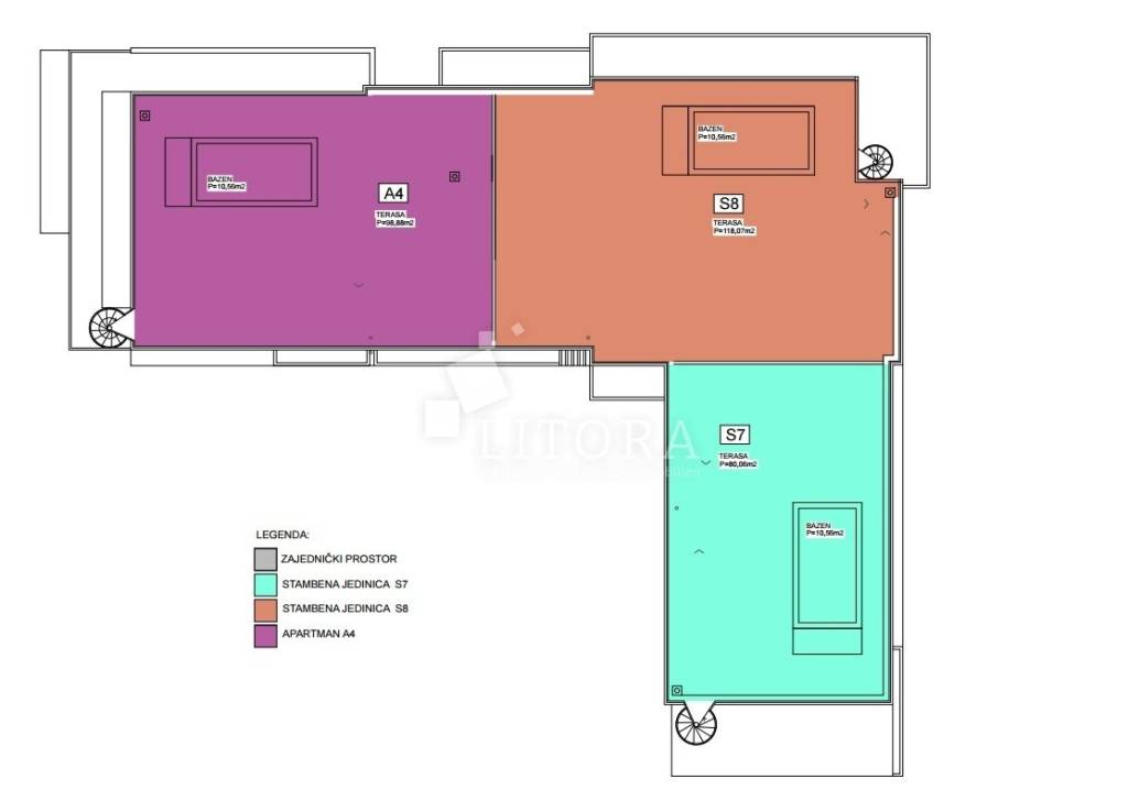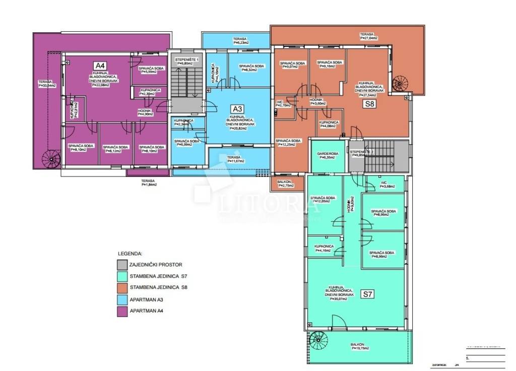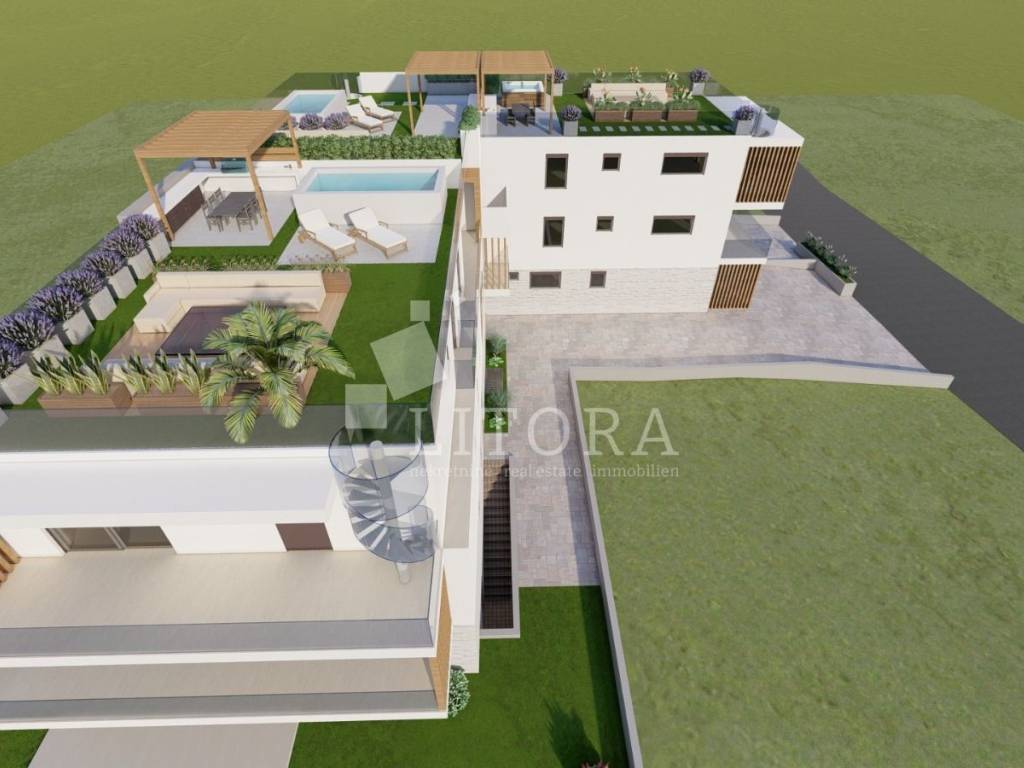 Vodice, Wider Center – 2nd Row from the Sea, New Build – Two-Bedroom Apartment, 100 m from the Beach.Located in a prime position in Vodice, in a quiet part of the wider city center, this modern two-bedroom apartment is situated on the 2nd floor + roof terrace of a high-quality new residential building. The property is positioned in the 2nd row from the sea, just 100 meters from the beach and 400 meters from the town center. Apartment S7 offers a total usable area of 192,35 m² and comprises: entrance hallway, 3 bedrooms, 2 bathrooms, open-plan living room with kitchen and dining area, access to a spacious terrace of 19,75 m² and spiral stairs whichlead to the roof terrace size 80,06 m2 with pool size10,56 m2. The building features contemporary architecture and will be constructed using high-quality materials, including: premium flooring, modern interior and exterior carpentry, air conditioning for heating and cooling in every room, electric roller shutters and mosquito screens, underfloor heating in the bathroomsThe apartment also includes one garage parking space. Estimated completion and move-in: Summer 2026. This is an ideal property for a holiday home, rental investment, or comfortable year-round living, in one of Vodice’s most desirable locations—just few steps from the sea and close to all amenities.