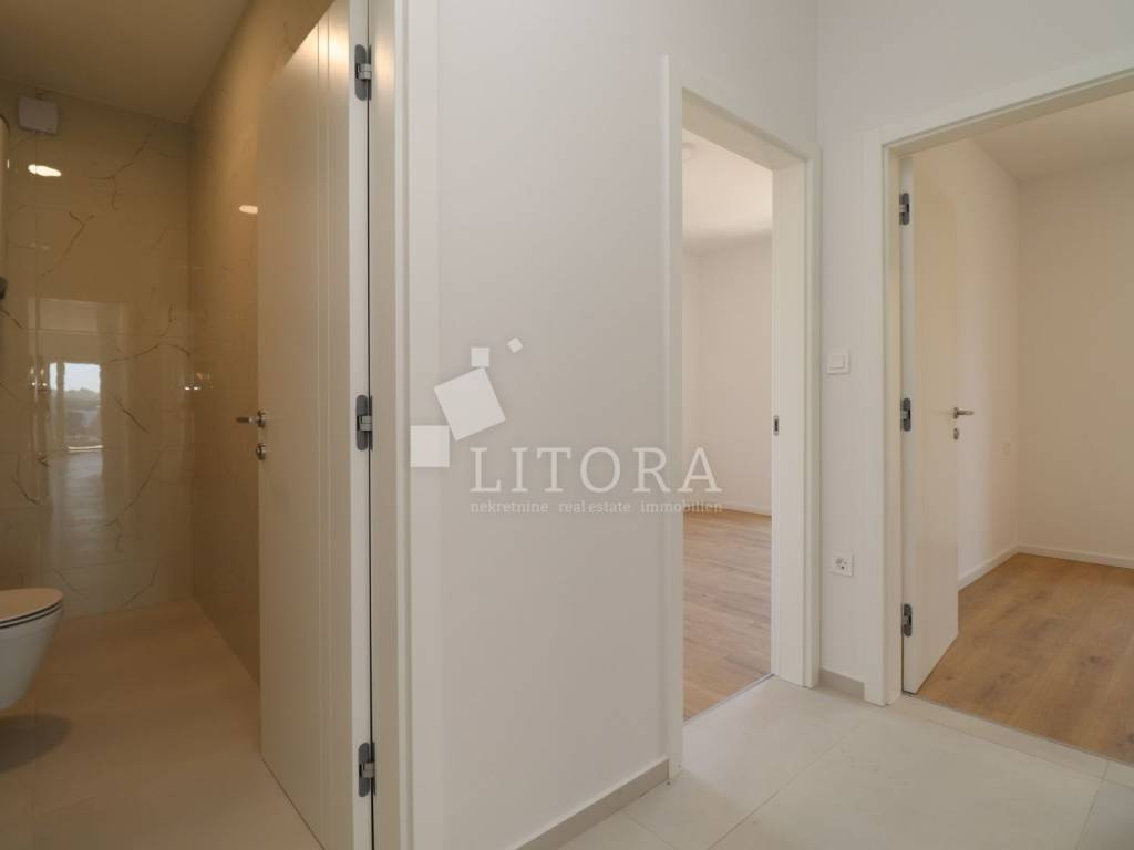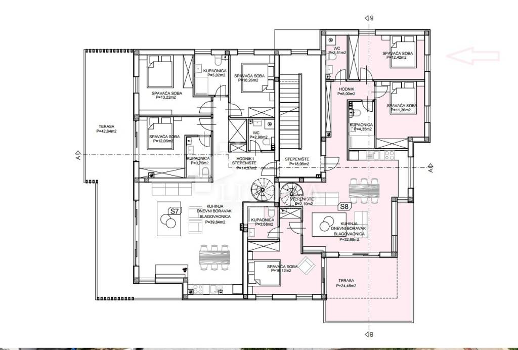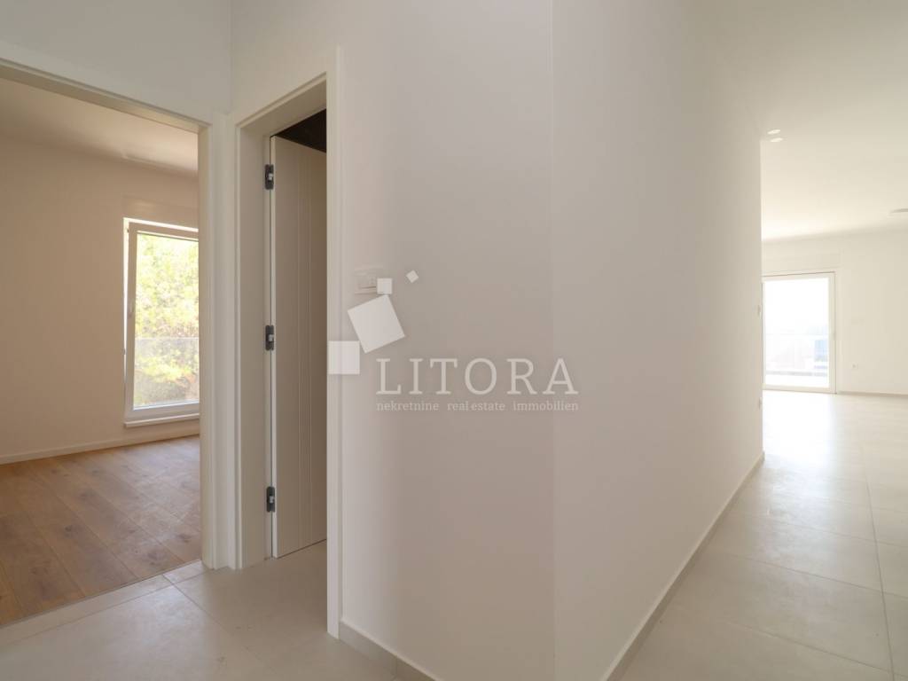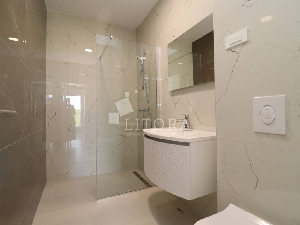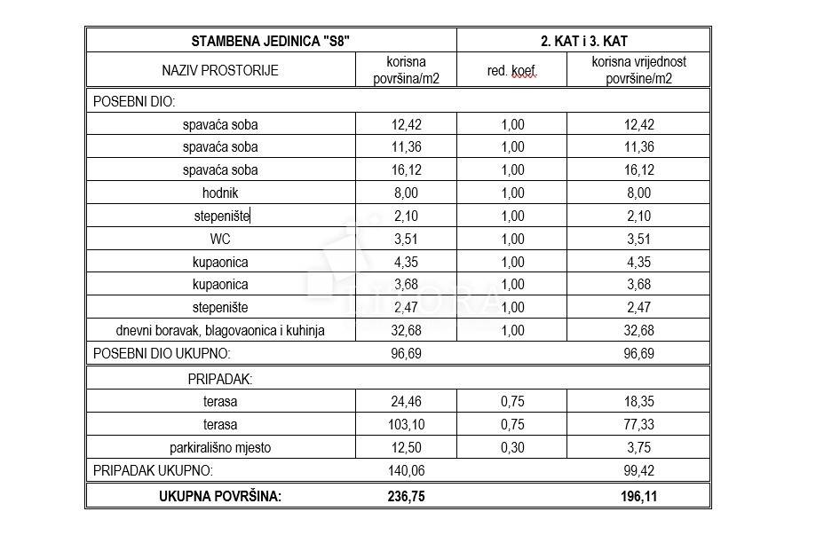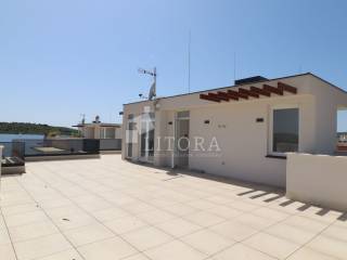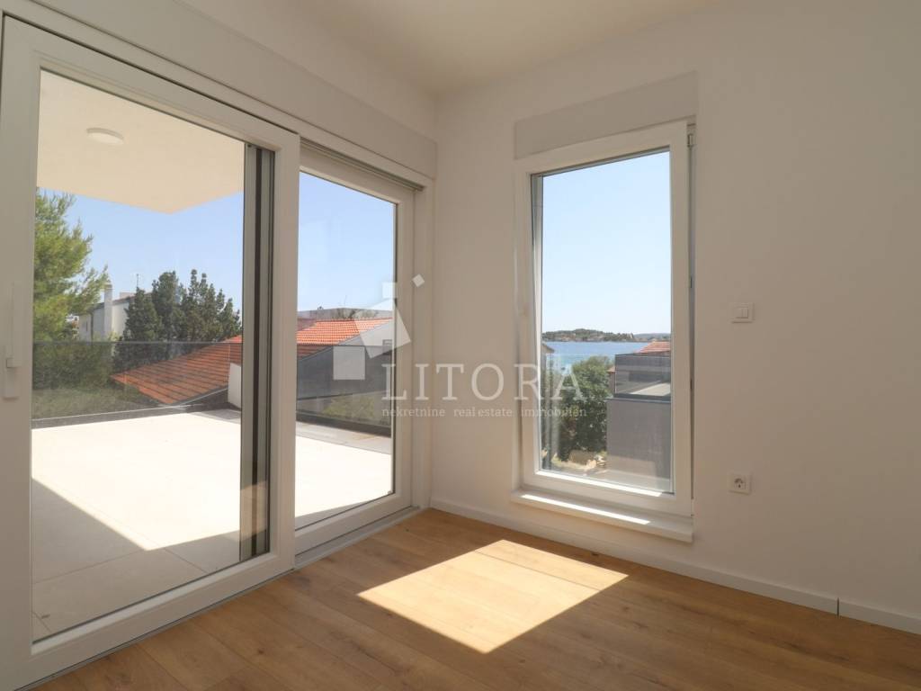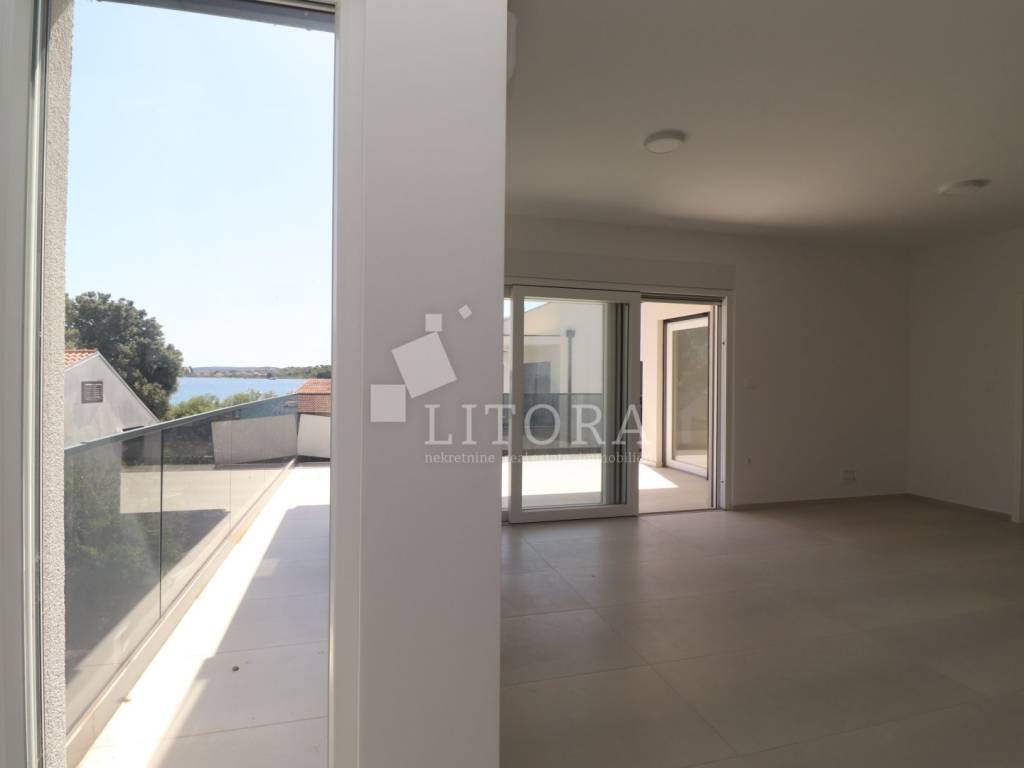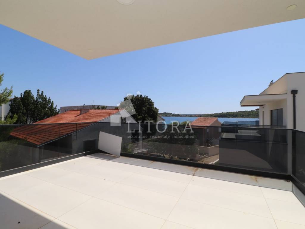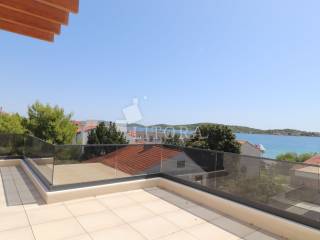 The apartment is located in a newly built residential building, positioned in the second row from the sea. The total usable area is 196,11m² and it spans the second and third floors of the building. It is oriented toward the southeast. On the lower level (2nd floor), there is an entrance hall, guest WC, hallway, three bedrooms, two bathrooms, and a spacious kitchen with dining area and living room, with access to a covered terrace of 24,46 m² offering a sea view. From the living room, spiral stairs lead to the upper level (3rd floor), where you'll find a spacious rooftop terrace of 103,10m2 with infrastructure, an additional guest WC, and a stunning panoramic view of the sea, beach, and the island of Prvić. The apartment is ready to move into and is equipped with a chimney connection, underfloor heating in the bathroom, electric roller shutters, insect screens, and thermal façade insulation. One outdoor parking space is included with the apartment.