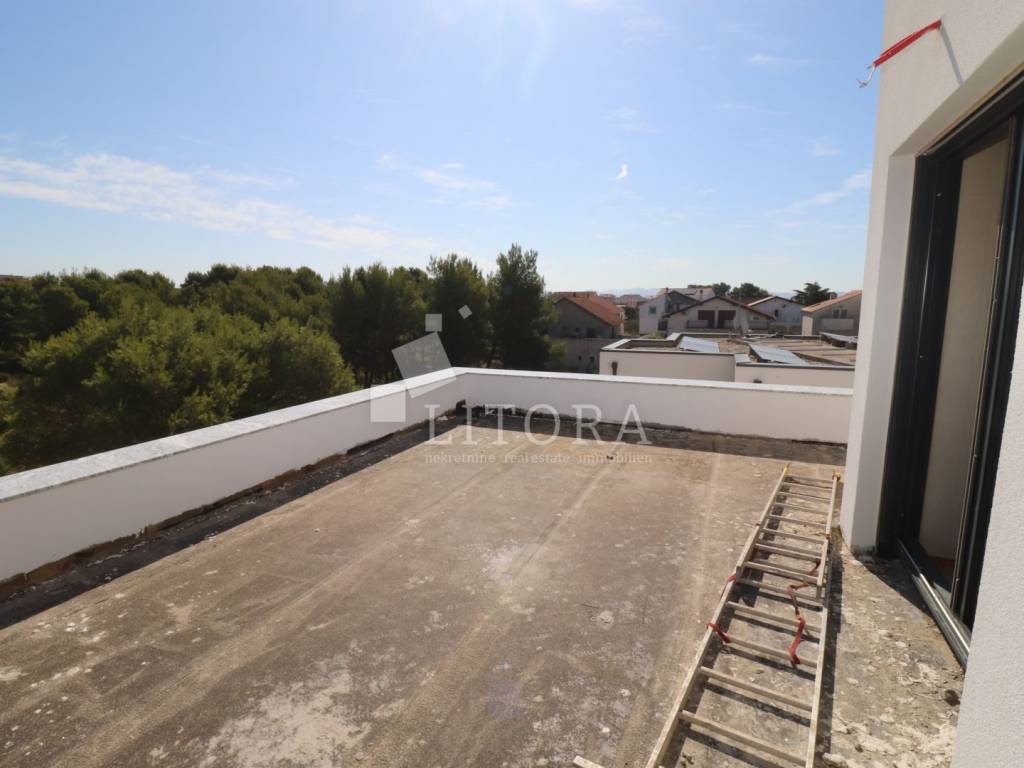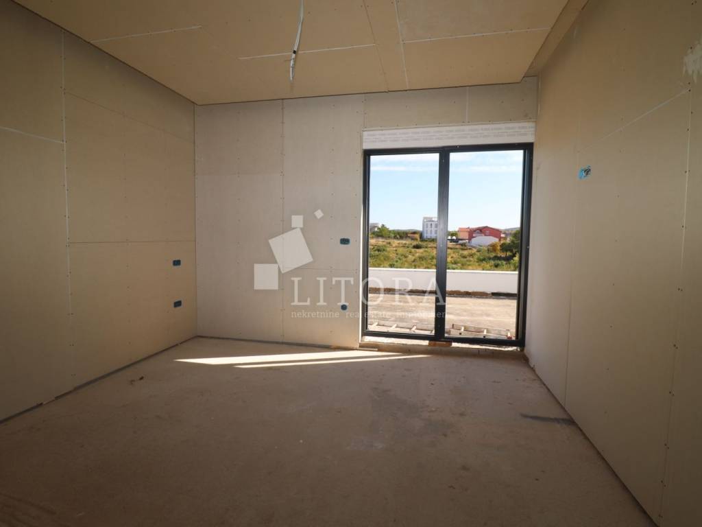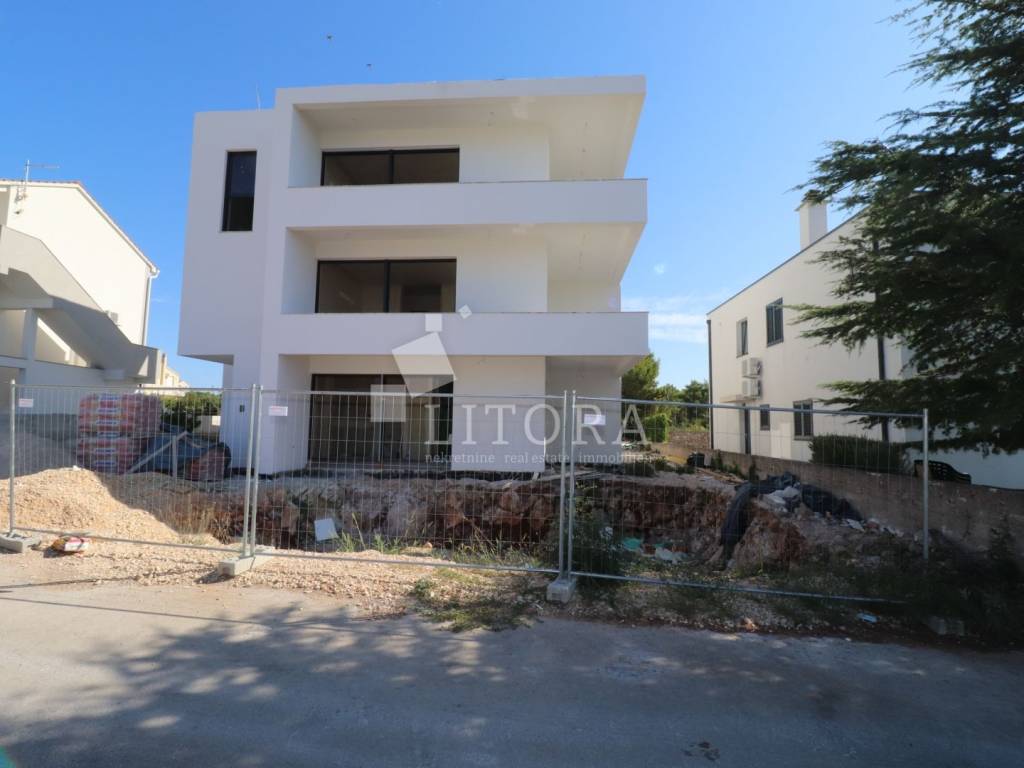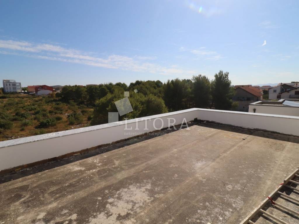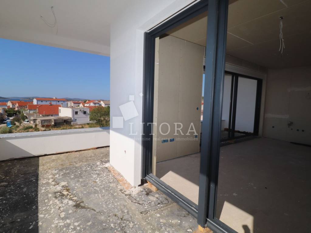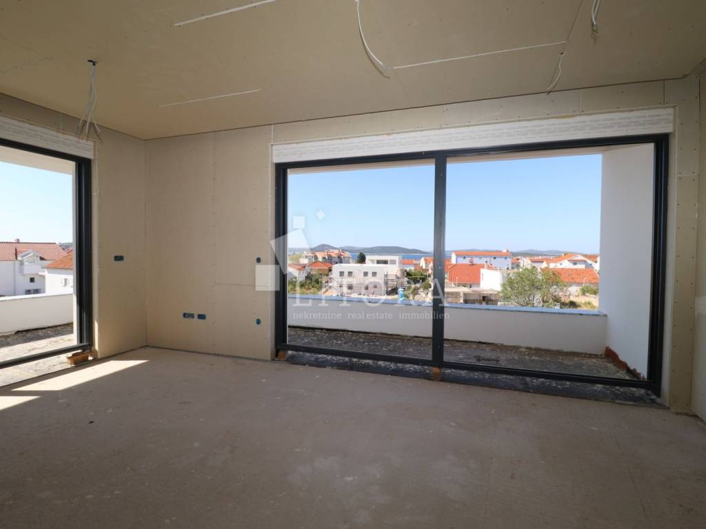 Vodice – A modern apartment in a new residential building is for sale, located on the second floor of a small apartment complex in a quiet area. With a total usable area of 133,49 m², the apartment features 3 bedrooms ( one of them with huge terrace), a bathroom, toilet, a hallway, and a spacious open-plan living room with a kitchen and dining area that opens onto a covered terrace with an open sea view. One outdoor parking space is included in the price. The distance to the sea is 700 meters, and the town center is 1,150 meters away. The building is being constructed to modern standards, using high-quality materials with a focus on energy efficiency. Move-in is planned by the end of 2025. Buyers have the opportunity to customize the interior according to their preferences. Ideal for year-round living, a vacation home, or tourist rental.