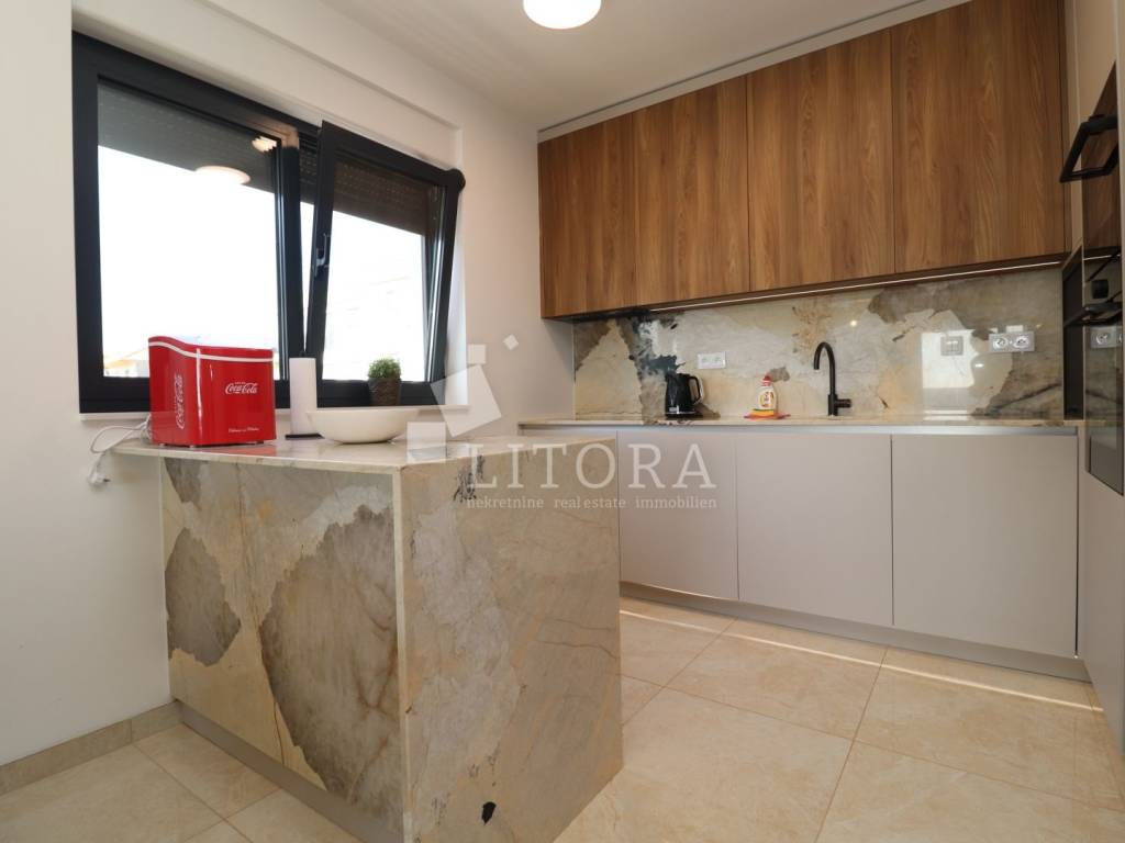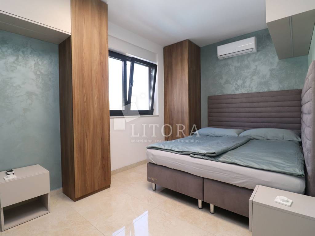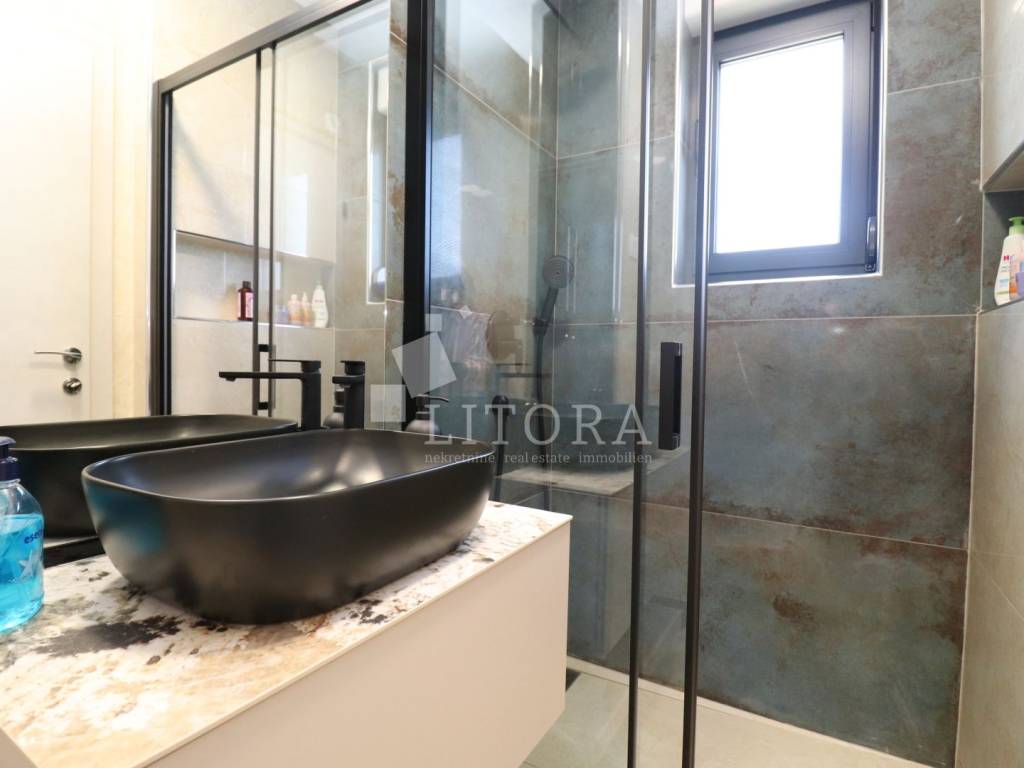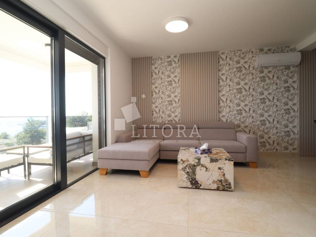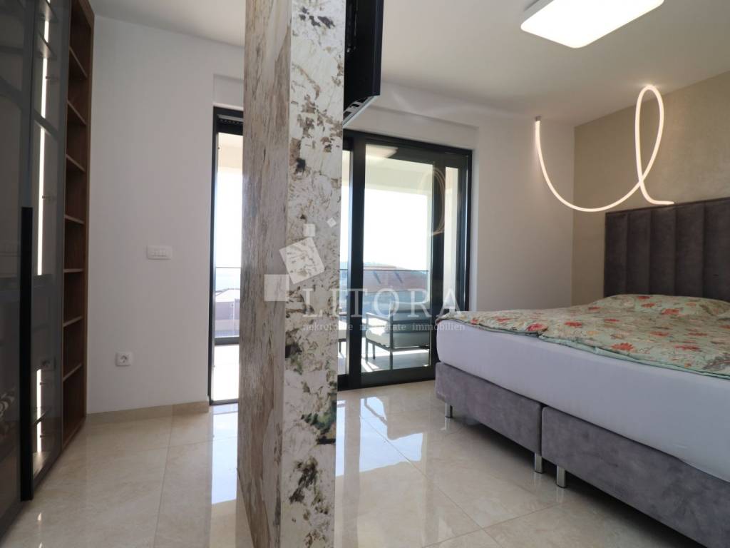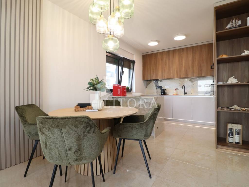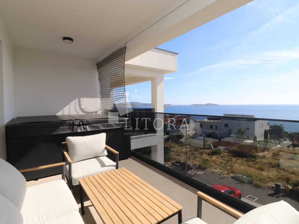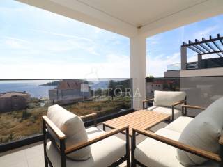 Zečevo Rogozničko – luxurious penthouse in Zečevo Rogozničko, with a total usable area of 102.60 m², located on the second floor of a modern residential building, just 200 meters from the beach. The apartment consists of a hallway, two bedrooms, one of which has its own bathroom and access to the terrace, an additional bathroom, a separate toilet, and a spacious living room with kitchen and dining area that opens onto a large terrace equipped with a jacuzzi. The penthouse is air-conditioned, fully furnished, and designed by an interior designer, with all furniture and equipment included in the price. Additional value is provided by two outdoor parking spaces and a private yard of 44.50 m². The apartment is equipped with high-quality ceramics, sanitary ware, and carpentry, underfloor heating in the bathrooms, as well as mosquito nets on all openings. The distance to the center of Rogoznica is 3,000 meters, while the sea and beach are only 200 meters from the property, making this penthouse an ideal combination of luxury, comfort, and an attractive location.