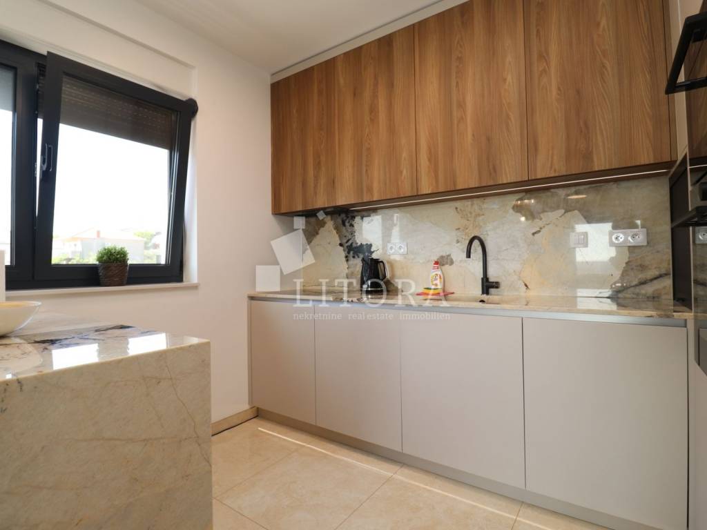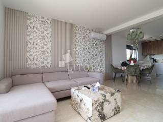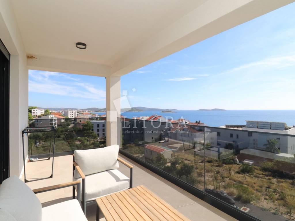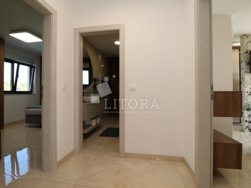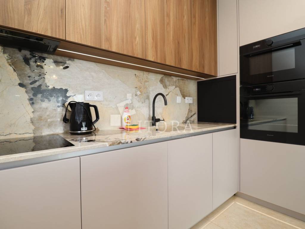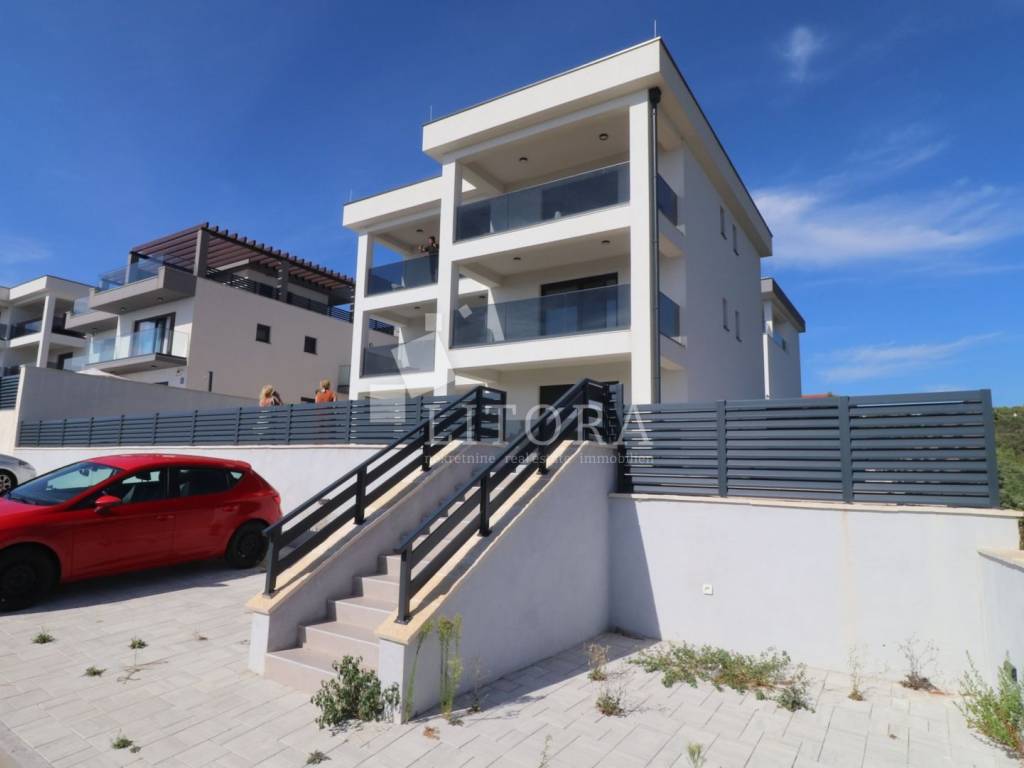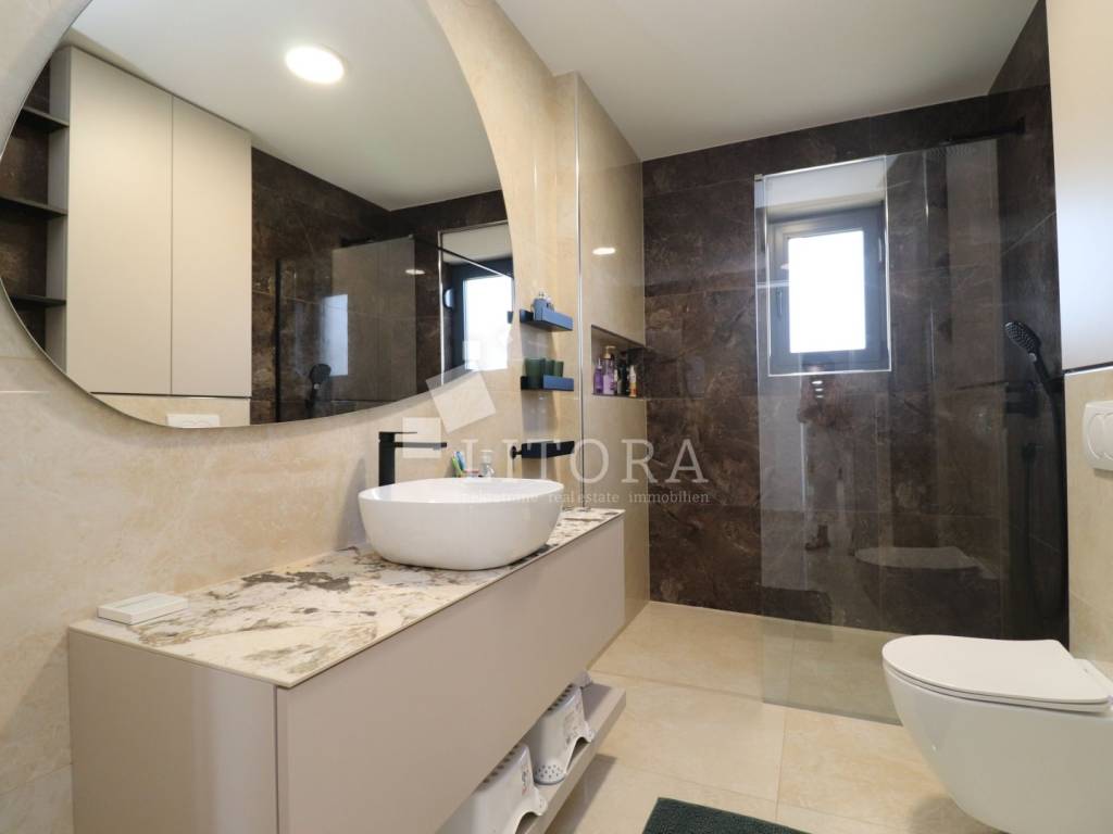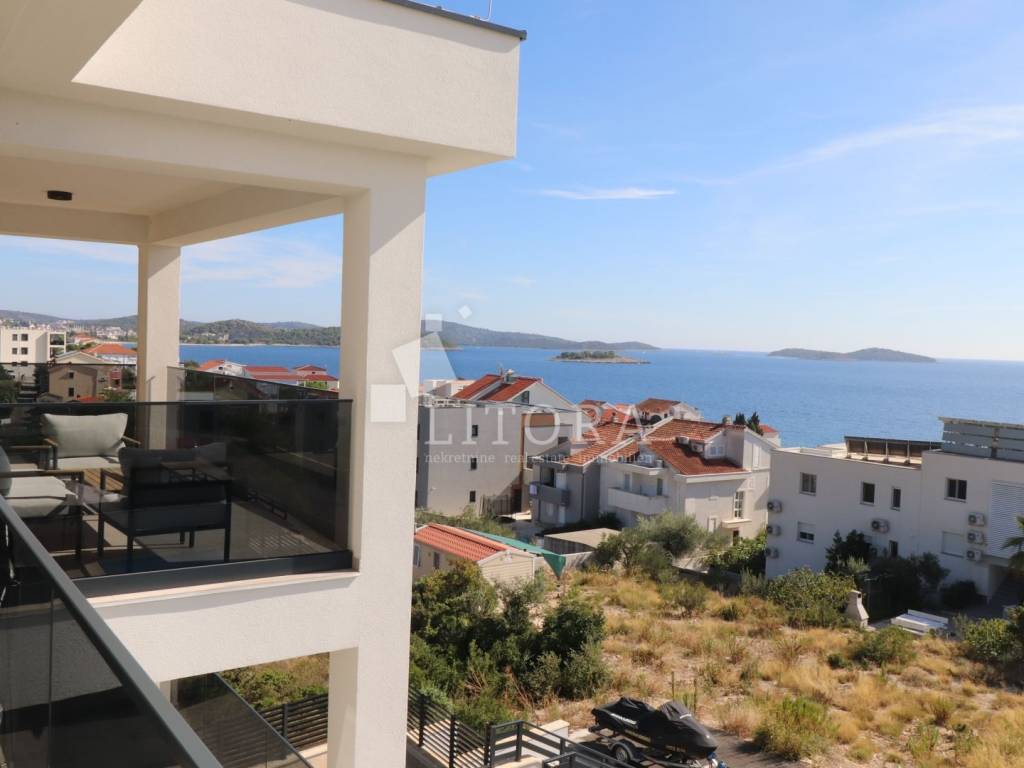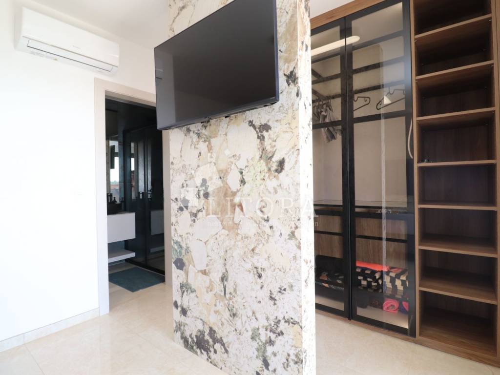 Zečevo Rogozničko – luxurious penthouse in Zečevo Rogozničko, with a total usable area of 102.60 m², located on the second floor of a modern residential building, just 200 meters from the beach. The apartment consists of a hallway, two bedrooms, one of which has its own bathroom and access to the terrace, an additional bathroom, a separate toilet, and a spacious living room with kitchen and dining area that opens onto a large terrace equipped with a jacuzzi. The penthouse is air-conditioned, fully furnished, and designed by an interior designer, with all furniture and equipment included in the price. Additional value is provided by two outdoor parking spaces and a private yard of 44.50 m². The apartment is equipped with high-quality ceramics, sanitary ware, and carpentry, underfloor heating in the bathrooms, as well as mosquito nets on all openings. The distance to the center of Rogoznica is 3,000 meters, while the sea and beach are only 200 meters from the property, making this penthouse an ideal combination of luxury, comfort, and an attractive location.