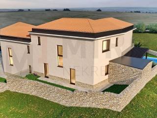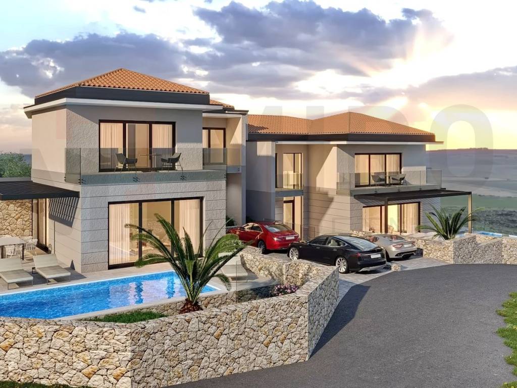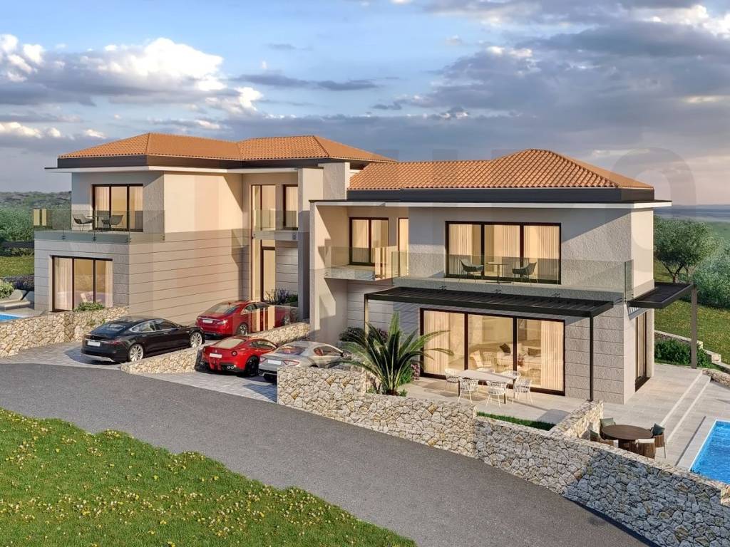 Island of Krk, Vrbnik, new modern house with panoramic sea view. Semi-detached house, ground floor and first floor, net area 171 m2. On the ground floor there is an entrance area, a storage room, a technical room, a laundry room, a toilet, a room, a spacious, open space living room with a kitchen and dining room, with access to the terrace and garden. An internal staircase leads to the first floor of the house, where there is an entrance hall, three bedrooms, each with its own bathroom, two of which have exits to the terrace. On a beautifully landscaped garden with Mediterranean plants, there will be a swimming pool, a sun deck, and a summer terrace. In addition to all of the above, there will also be an auxiliary space and two parking spaces on the garden plot. The house is characterized by high-quality and modern construction, a good layout of the rooms, top-quality materials and sanitary facilities, and a quiet location. Sale according to the "turnkey" system, the expected completion of the works is the spring of 2024. VAT is included in the price, the buyer does not pay real estate sales tax. Visit us and find the square footage of your home!