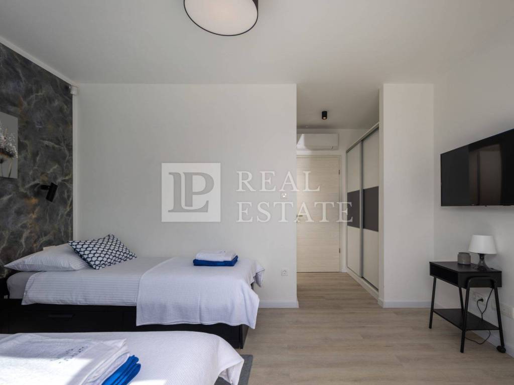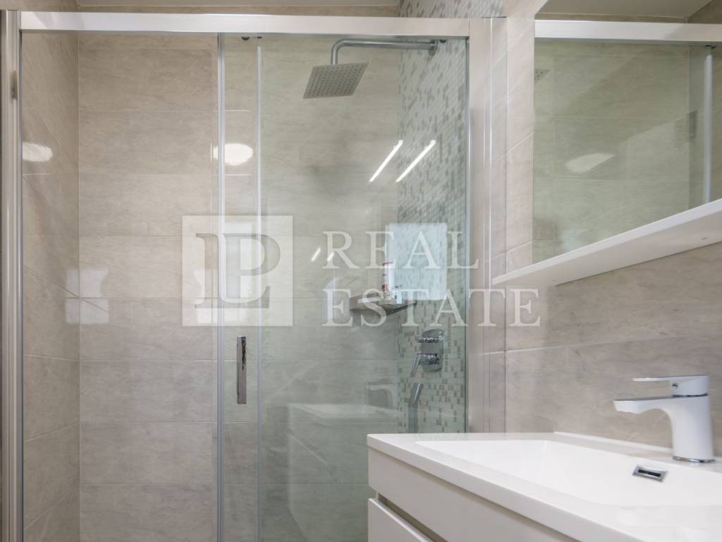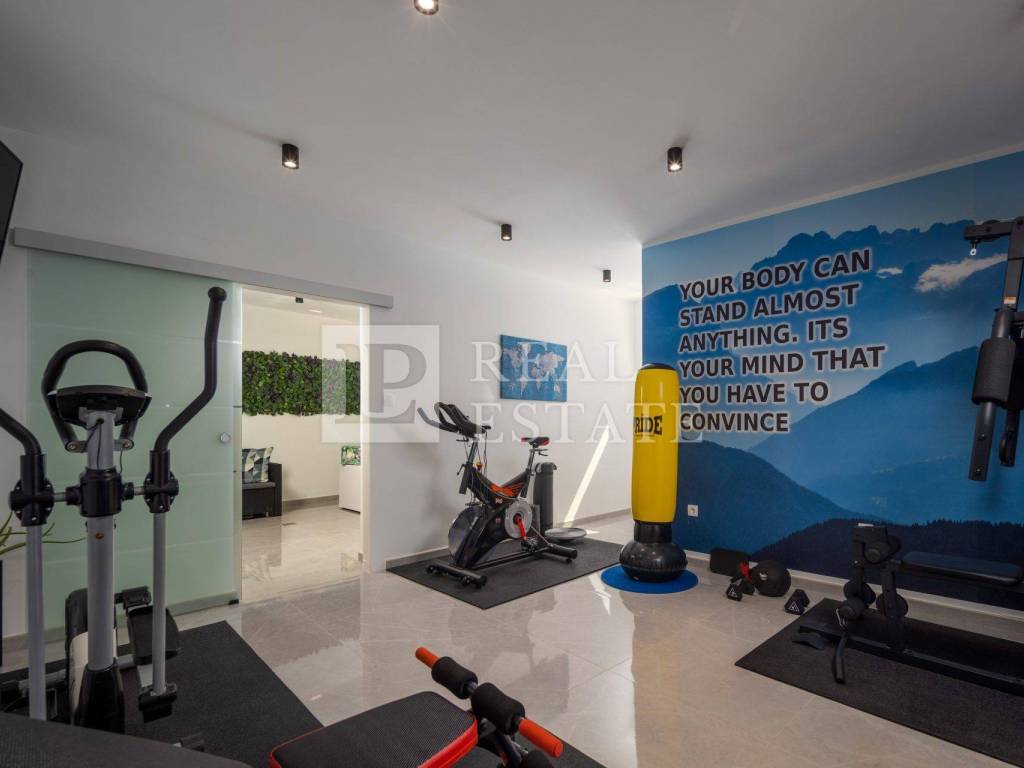 Il primo piano è raggiunto da una scala interna, dove ci sono due camere da letto con i propri bagni e accesso al terrazzo. Al piano interrato della villa è presente una palestra, wellness, una stanza per la socializzazione, un ripostiglio e un servizio igienico.