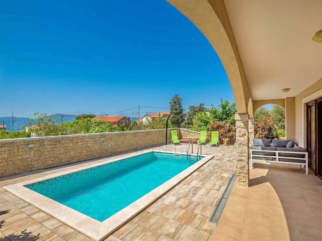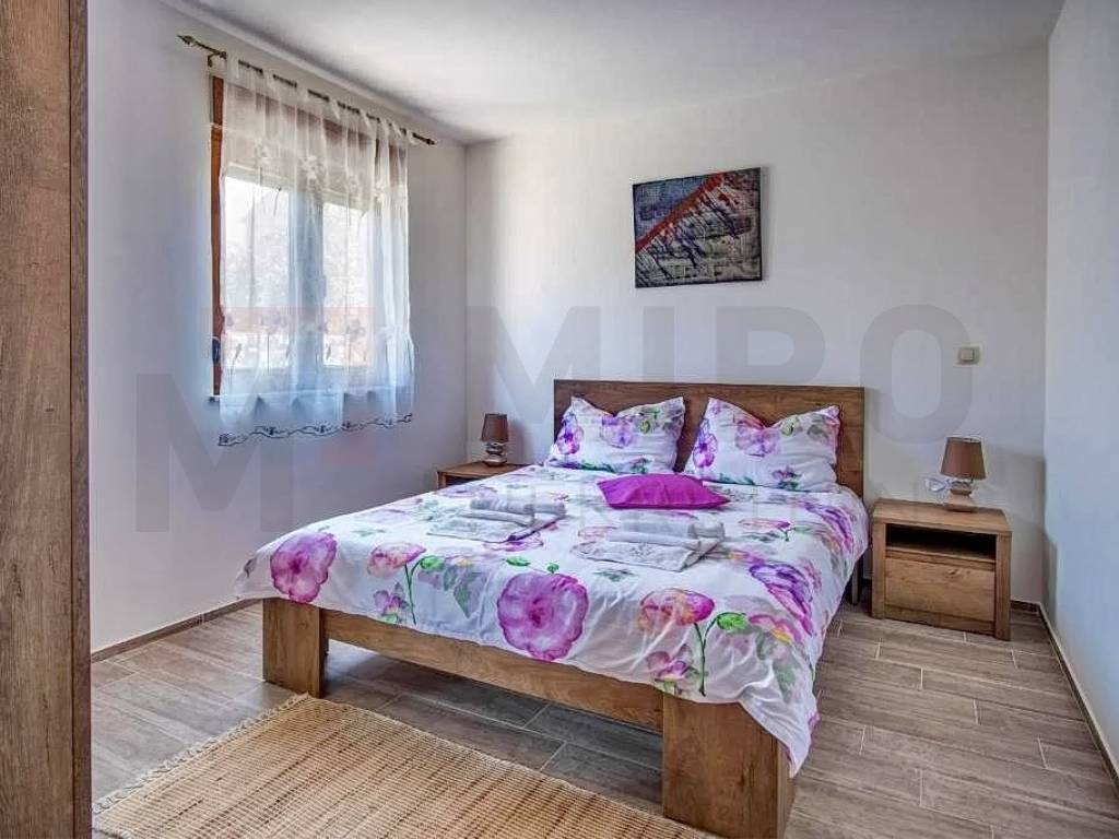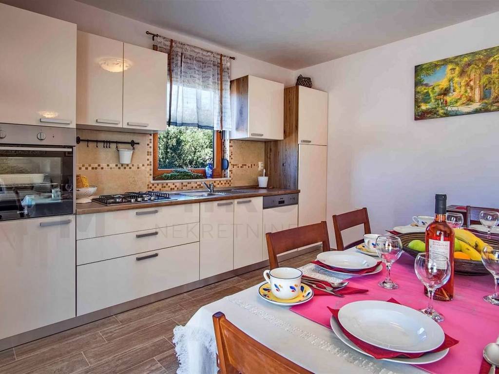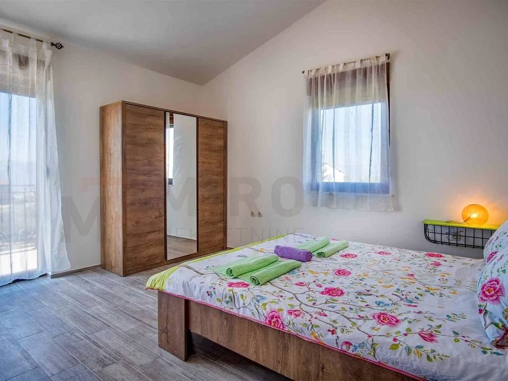 Island of Krk, Krk, surroundings, Mediterranean semi-detached house with two residential units and two swimming pools with a beautiful view of the sea. A semi-detached house in a quiet location has an area of 350 m2, the house has two floors, ground floor and first floor. On the ground floor of each residential unit there is an entrance hall, a bedroom, a bathroom, a staircase, a large living room with a dining room, a kitchen combined into one unit, from which there is an exit to an outdoor covered terrace with a sun deck and a swimming pool. The internal stairs of each residential unit lead to the first floor where there are three bedrooms, each with its own bathroom and access to a balcony with a wonderful view of the sea. The semi-detached house has a landscaped garden with a sunbathing area, two equipped swimming pools, two outdoor showers, two storage rooms, a special place in the landscaped garden is a gazebo with a barbecue. Each house has two parking spaces. homestead. The equipment of the semi-detached house includes high-quality ceramics, PVC carpentry, high-quality sanitary ware, TV, air conditioning in all rooms. This property is owned by a natural person. The property has an established rental business and permanent guests, an investment opportunity. The seller guarantees clean ownership documentation of the house.