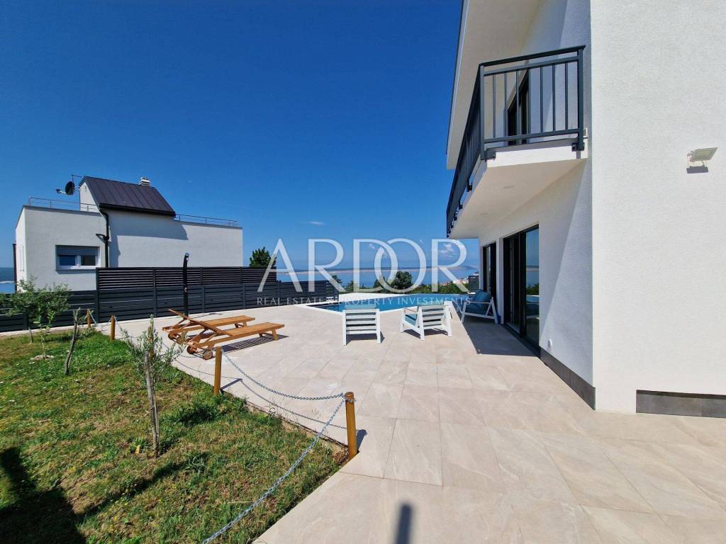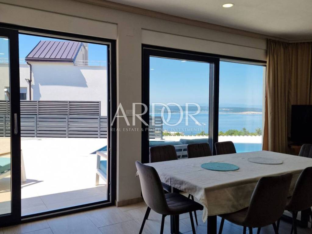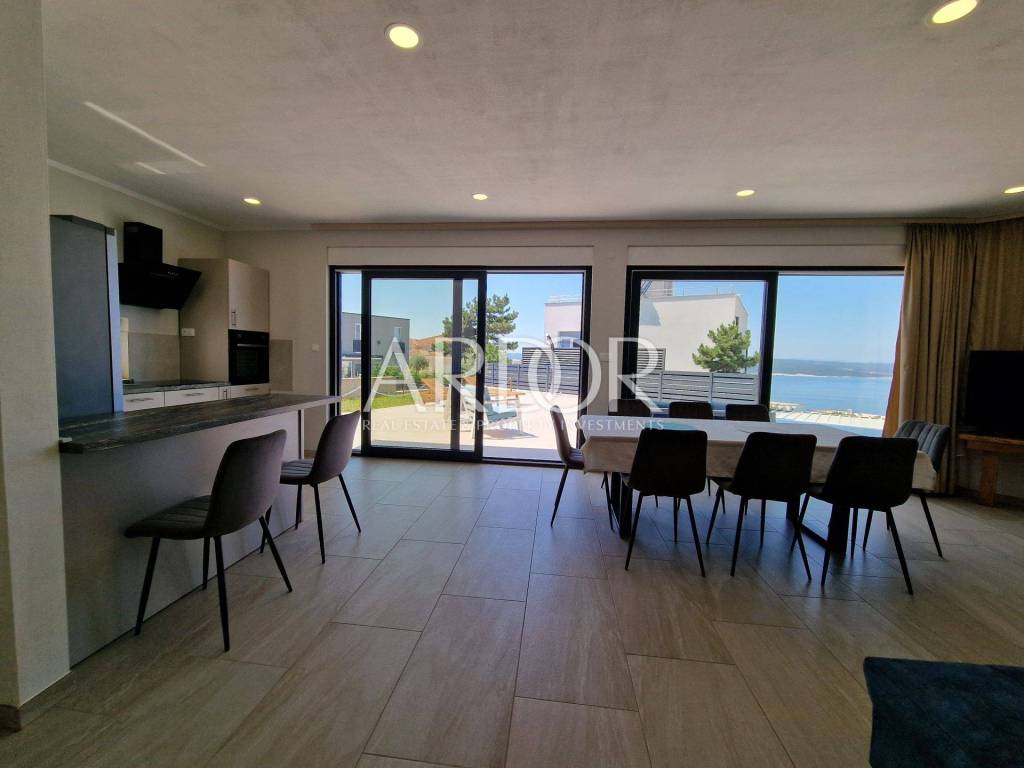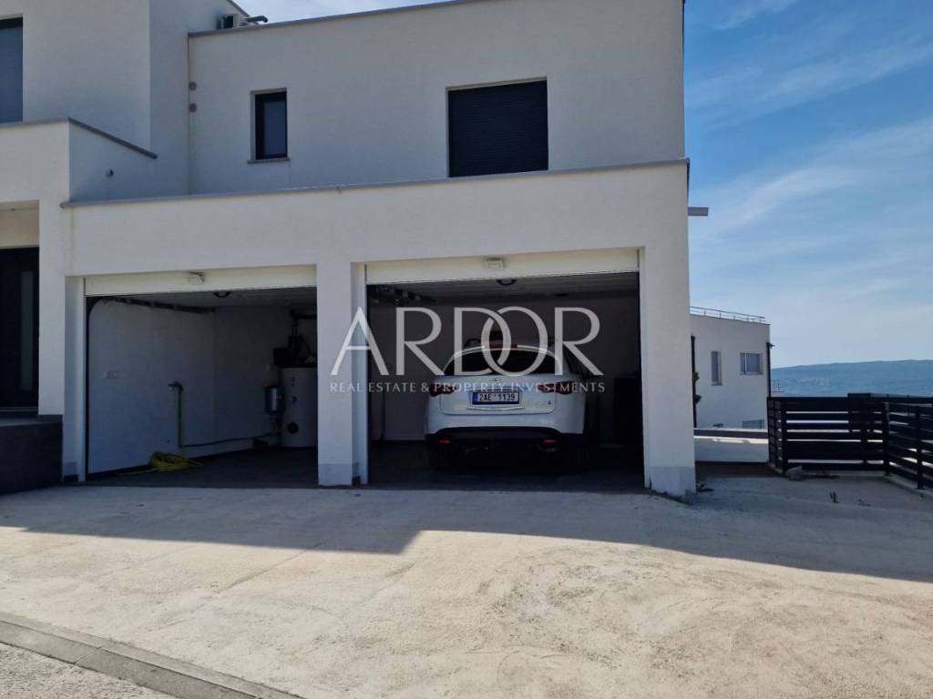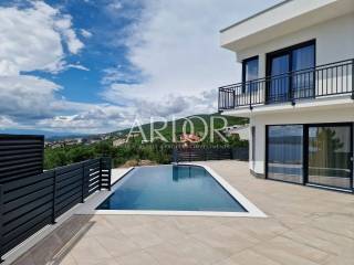 Crikvenica, casa di lusso in affitto con vista panoramica sul mare e piscina. La casa è di recente costruzione, moderna e dotata di mobili di qualità. Al piano terra si trovano i servizi igienici e una zona open space con cucina, sala da pranzo e soggiorno, dalla quale si accede attraverso una parete in vetro alla terrazza e alla zona solarium con piscina. Al piano rialzato si trova una camera con il proprio bagno, mentre al primo piano ci sono tre camere da letto con il proprio bagno e un terrazzo con vista mare. L'immobile dispone di un altro piano intermedio dove si trova una camera con bagno ed un piccolo balcone. L'acqua calda viene riscaldata tramite pannelli solari e l'edificio è riscaldato tramite riscaldamento a pavimento. L'edificio dispone di un garage con due posti auto.