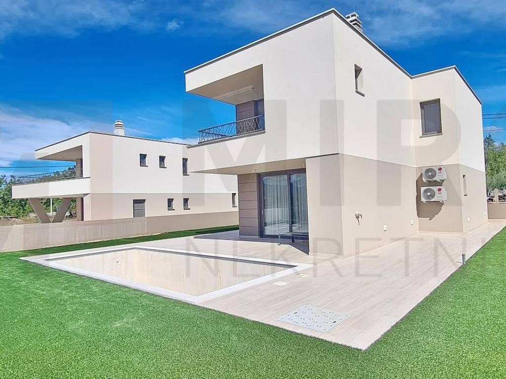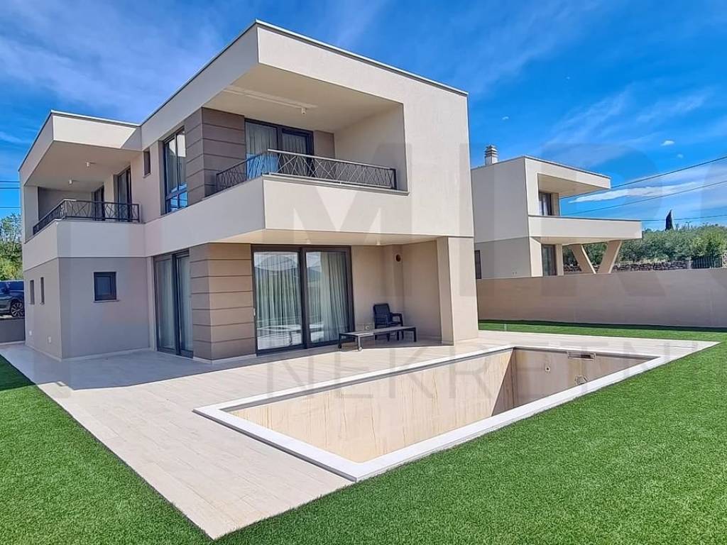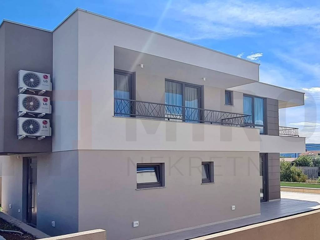 Island of Krk, City of Krk, wider area, modern designed house on 2 floors, surface area 212 m2. The mentioned area includes the entrance area, living room with kitchen and dining room, one bedroom with bathroom, separate toilet, storage room and a large covered terrace on the ground floor. Upstairs there are 3 bedrooms with exits to the terrace, 2 bathrooms, wardrobe. The ownership of this house also includes a carefully arranged garden, specially refined with a 25 m3 swimming pool and a sunbathing area, as well as two parking spaces. High quality of construction and equipment, underfloor heating, multi-split room air conditioning, video surveillance, possibility of installing photovoltaic panels, charging station for electric cars with an additional charge at the customer's choice. The planned completion of the works is at the end of 2024. There is a possibility of buying a property in the "high Rohbau" phase, in which case the price of the property is €460,000. The property is owned by a legal entity and in the VAT system. The seller guarantees proper ownership documents. Visit us and find the square footage of your home!