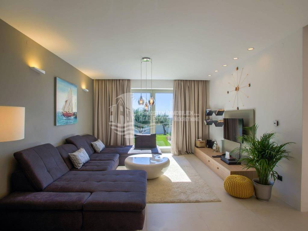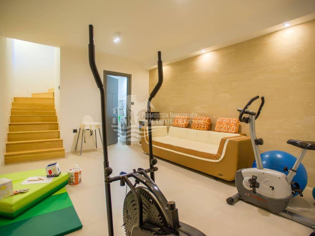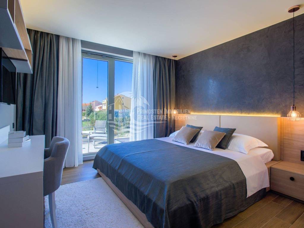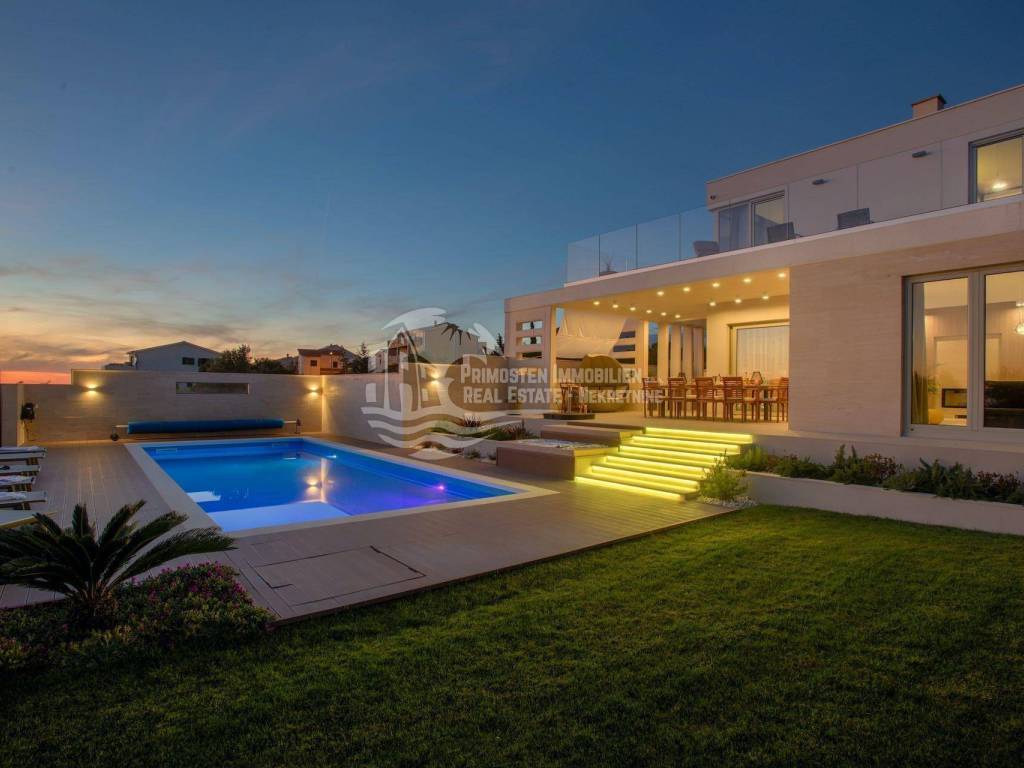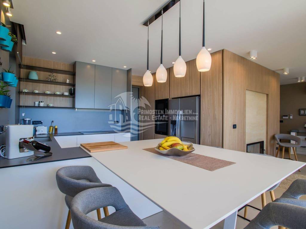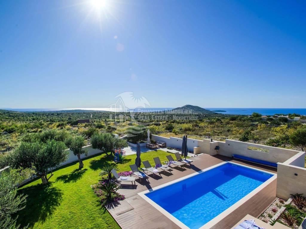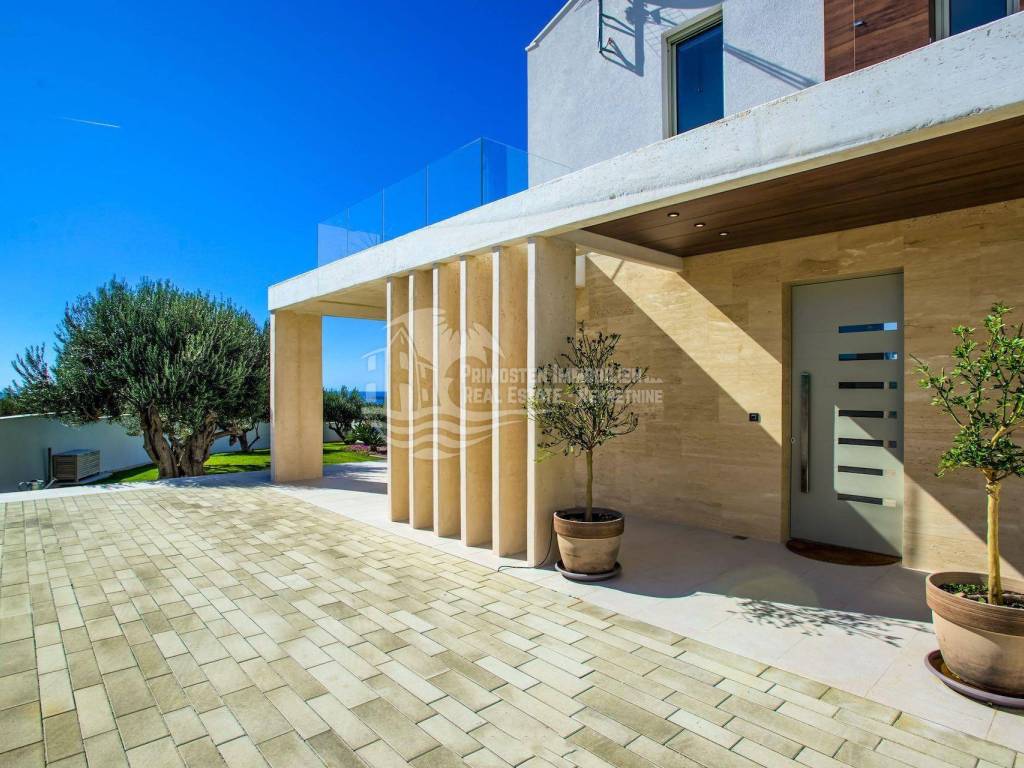 The top-class and luxurious villa near Primosten, completed in 2018, is located in an elevated position and faces south. The property extends over two floors with a basement and impresses with its high-quality furnishings, modern architectural style, sensational panoramic views of the open sea and the wonderful old town of Primosten. The location is very popular, as an unobstructed sea view is guaranteed. Shops, marinas and beaches are within a short distance. The living area of the villa is 219.29 m² and is encompassed by a 731 m² plot. A total of four bedrooms and bathrooms are available. On the ground floor there is a spacious living and dining area that opens into the open kitchen area, separate toilet, bedroom with bathroom, and a covered terrace with dining area and stone grill. An internal staircase leads to the light-flooded upper floor, which is divided into three bedrooms and three bathrooms. Two bedrooms each have a sun terrace with a wonderful sea view. All rooms are air-conditioned and fully equipped. Another highlight is the automatically irrigated outdoor area with lawn, swimming pool and olive trees. There are three parking spaces available. The villa has excellent annual occupancy and is suitable for renting or for your own use.