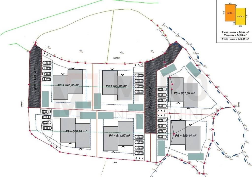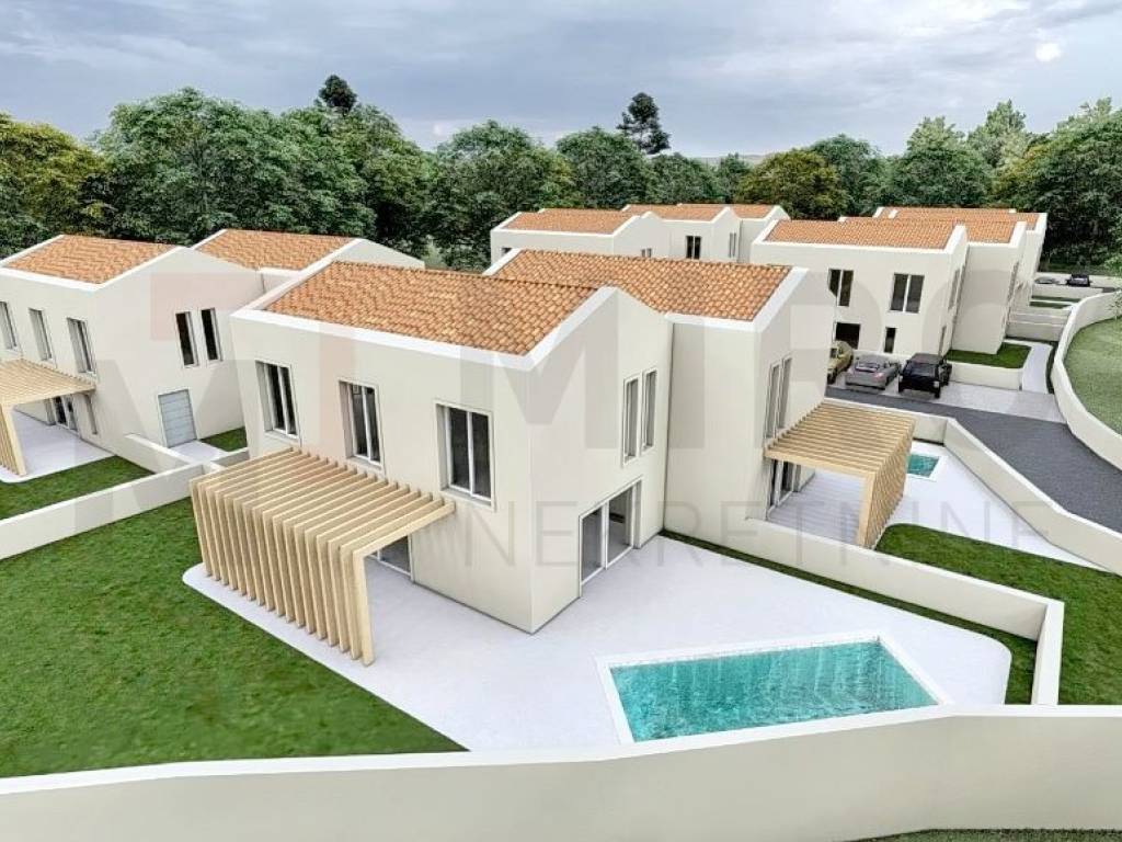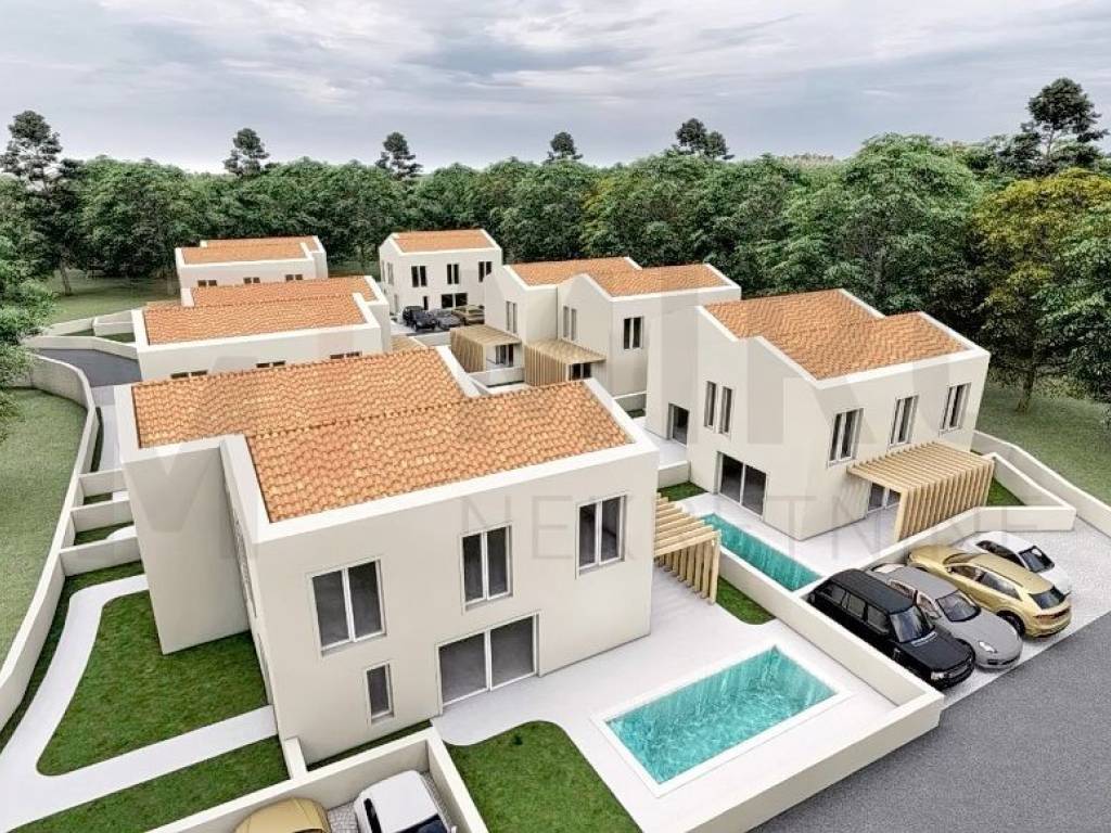 Otok Krk, Dobrinj, okolica, prodaja građevinskog zemljišta s idejnim projektom za gradnju dvojne obiteljske kuće s bazenom. Građevinsko zemljište površine 650 m2. Kuća stambene površine 145 m2 sastoji se od stepeništa, kuhinje, dnevnog boravka, blagavaone i WC u prizemlju, a na katu 3 spavaće sobe i dvije kupaone. Kući pripadaju dva vanjska parkirna mjesta i svaka ima svoj bazen cca 15m2. Sva potrebna infrastruktura voda, struja i asfaltni put nalazi se u neposrednoj blizini zemljišta. Nekretnini se može pristupiti s javne prometnice. Ova nekretnina je u vlasništvu fizičke osobe. Prodavatelj jamči čistu vlasničku dokumentaciju zemljišta. Posjetite nas i pronađite kvadrat vašeg doma!