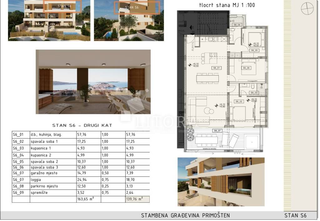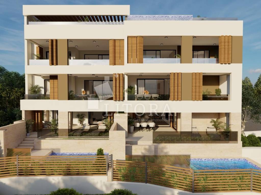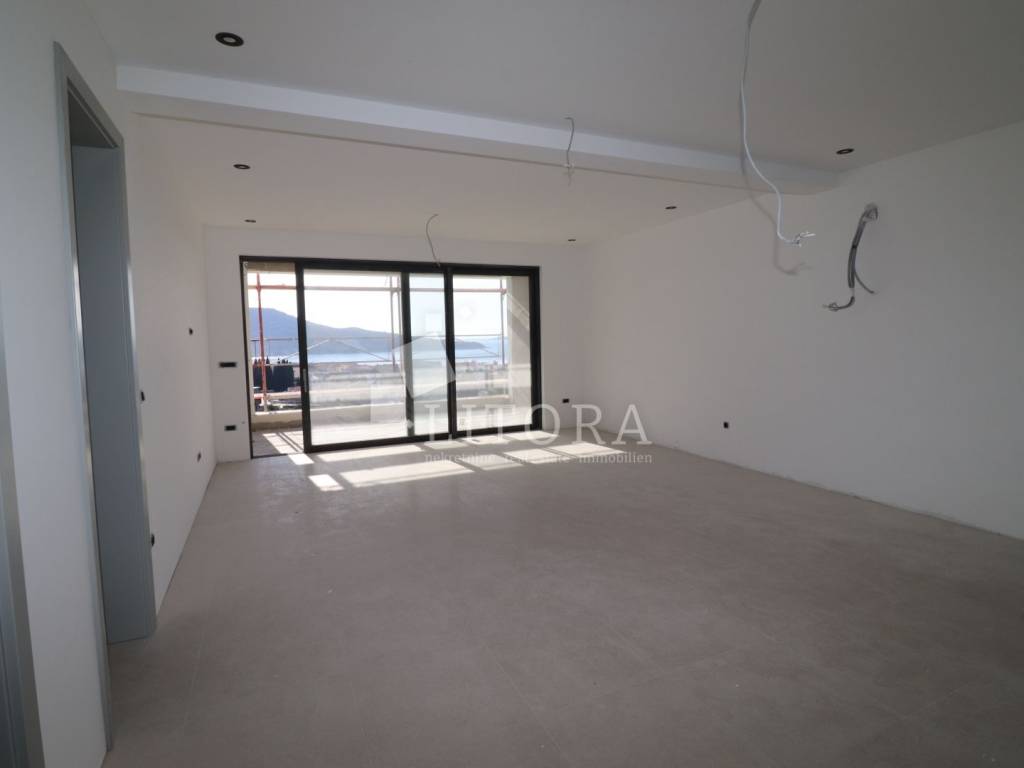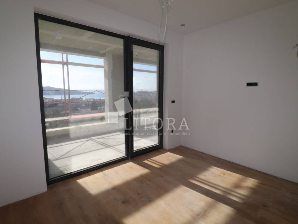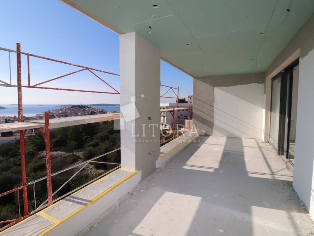 Primošten – Superbly equipped apartment with a jacuzzi, spacious terrace and panoramic sea view. In a quiet location of Primošten, with a beautiful panoramic view of the sea and a picturesque place, there is a modern apartment in the 2nd floor of a new building - designed to the highest standards of modern housing. The building is located in an ideal position: easily accessible by car, close to all public facilities, and at the same time sufficiently secluded for complete peace and privacy. Apartment S6 has 139.76m2 of usable area, oriented to the south. It consists of an entrance hall, modern bathroom, three comfortable bedrooms (one of which has its own bathroom) and a living area with access to a spacious terrace of 24,94 m² with a jacuzzi. The apartment is designed with an emphasis on quality and comfort and includes: underfloor heating (heat pumps), top-quality aluminum/PVC joinery with mosquito nets and electric roller shutters, high-quality ceramic floor coverings, a 12.50m2 garage parking space, an outdoor parking space, and storrage in the basement. The building is currently under construction, and completion and occupancy are scheduled for the end of 2025. The distance to the first beach is 400 m, and to the center of Primošten 550 m.
