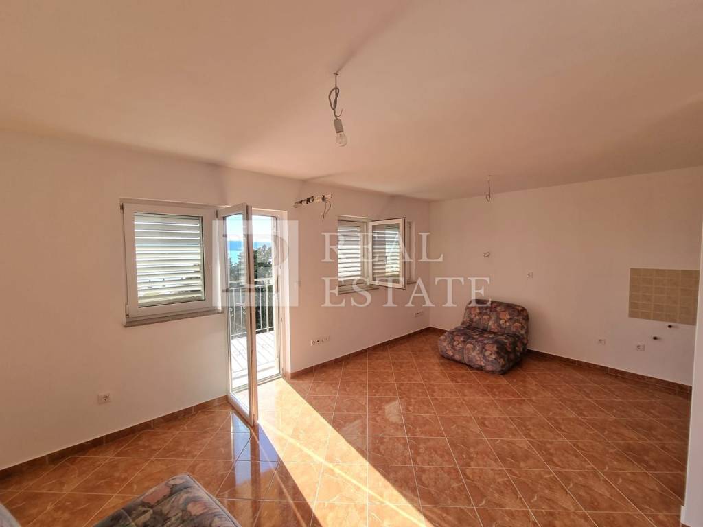 La zona giorno ha un concetto aperto e un orientamento a sud, che garantisce molta luce solare e una vista sul mare blu da tutta la parte anteriore dell'appartamento.