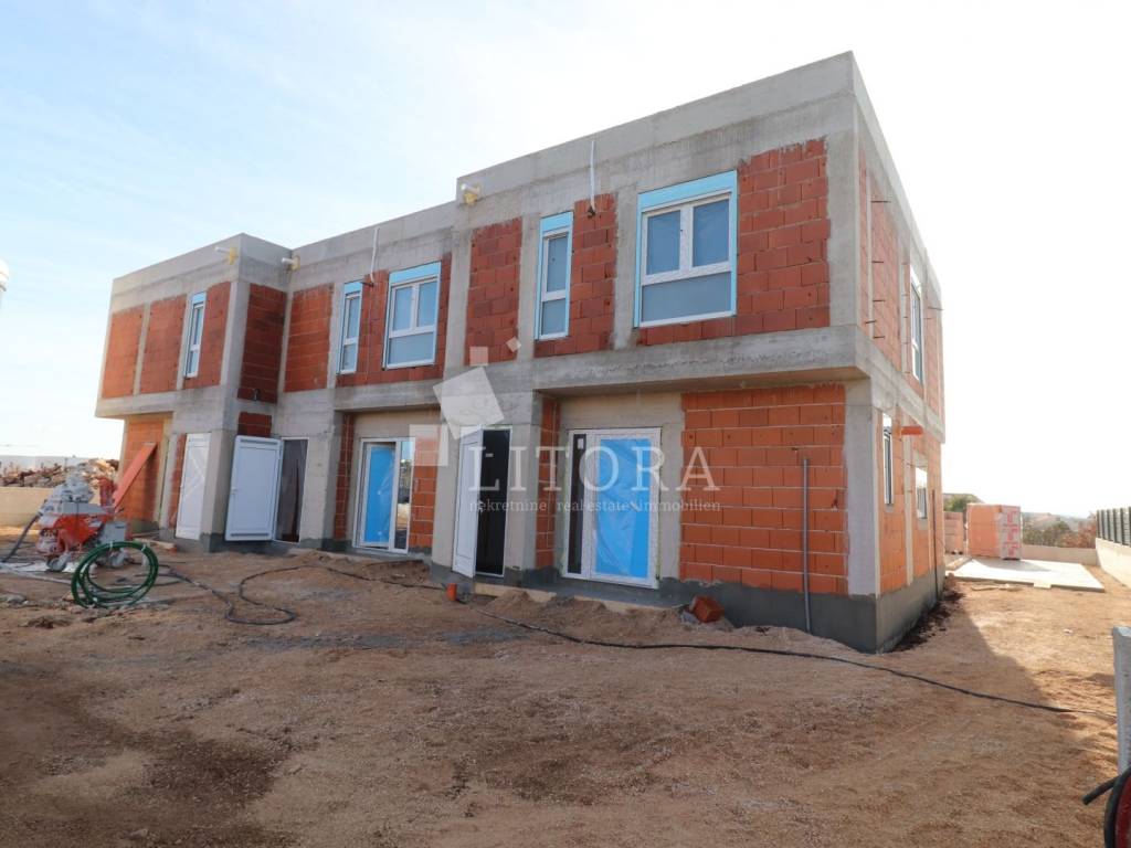 Vodice – Modern semi-detached family house in a quiet location with pool. The house is spread over two floors (ground floor + first floor) with a total usable area of 96.96 m². It features a large terrace/sundeck, an outdoor pool, and a spacious parking area for up to three vehicles. The ground floor includes an outdoor storage room, entrance hall, guest toilet, and an open-plan living room with kitchen and dining area, with access to the terrace. The first floor consists of three bedrooms and two bathrooms. The house is equipped to a high standard: security door, aluminium joinery with mosquito nets and shutters, high-quality ceramic tiles, underfloor heating in the living room and bathrooms. The property is fully fenced. It is located 1,000 m from Vruje beach and 850 m from the town center.