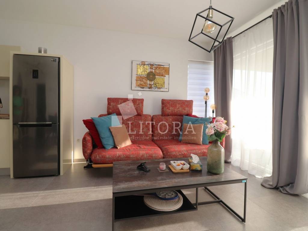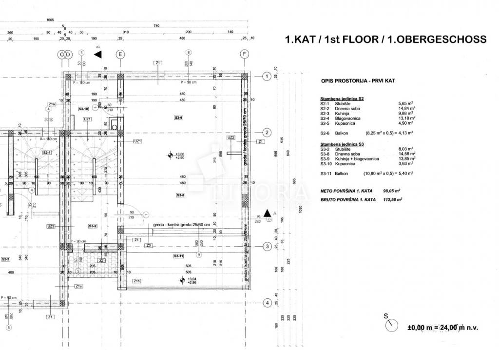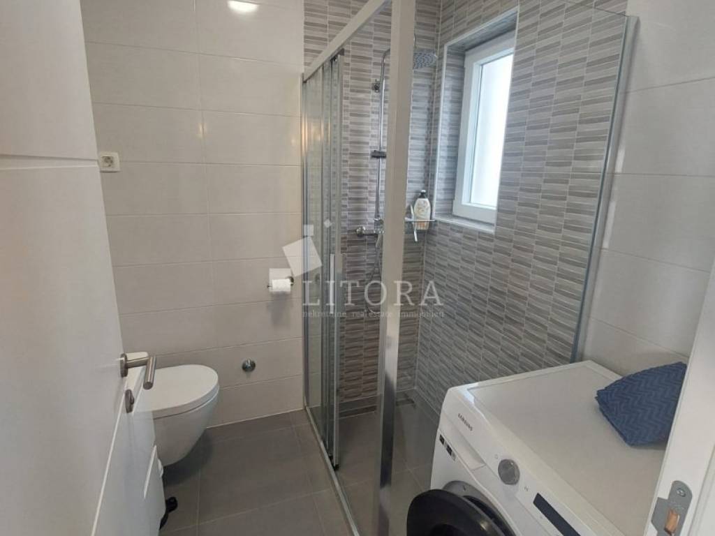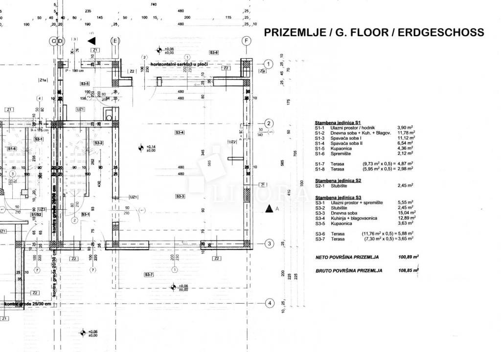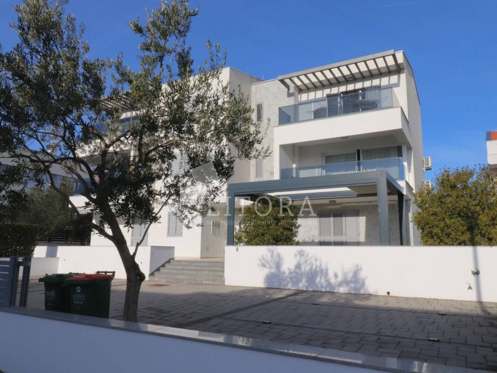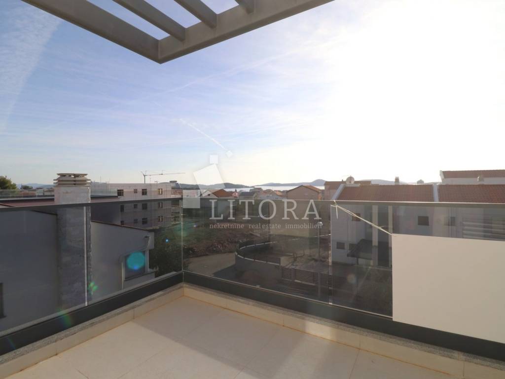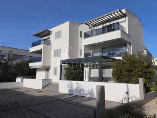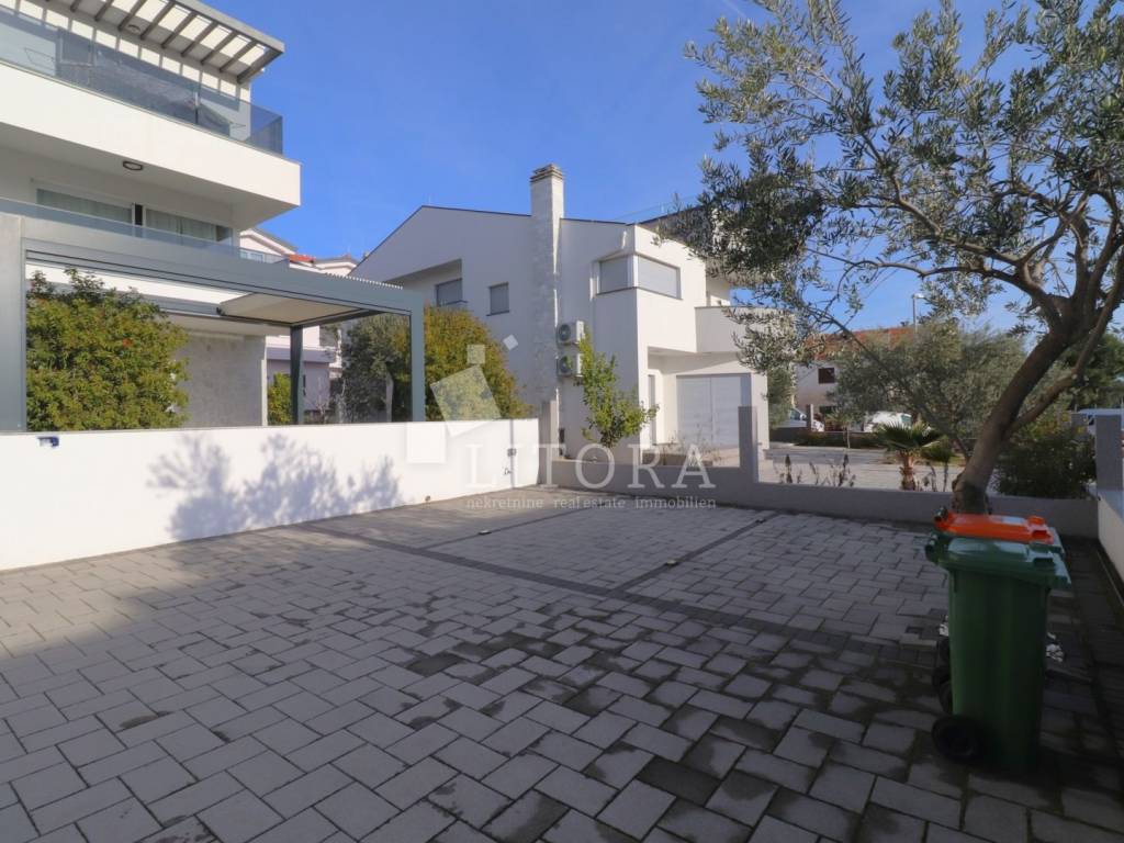 Vodice – close to the town center, family house. The house is spread over three floors: ground floor, first floor, and second floor, with a total usable area of 134.52 m², including an adjoining yard and paved terrace of 92.50 m², as well as three parking spaces. The property is a semi-detached house, oriented towards the southeast, with an internal staircase, and organized as two separate residential units. The ground floor comprises a one-bedroom apartment with an entrance area, living room, kitchen with dining area, bedroom, bathroom, and two terraces.