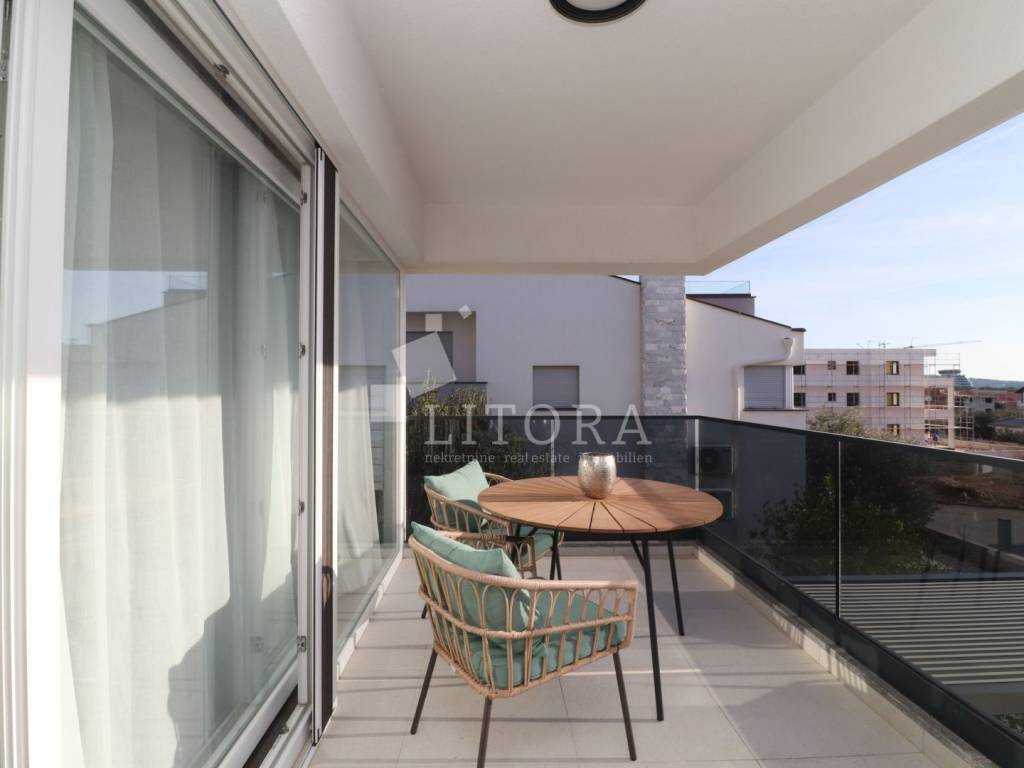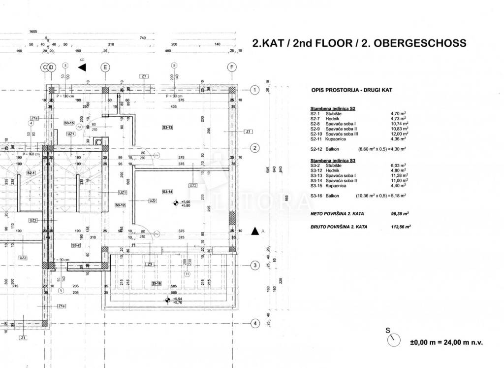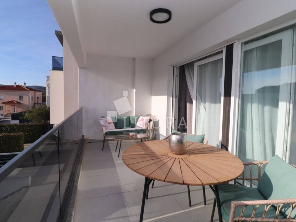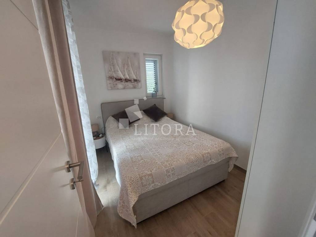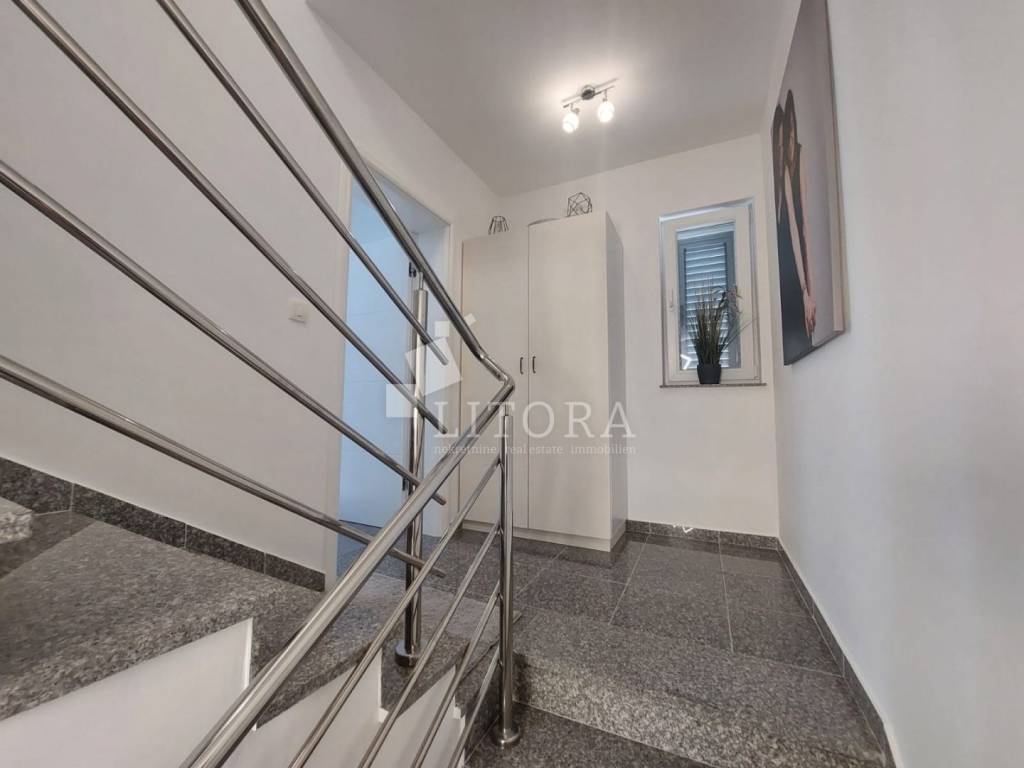 The first and second floors form a two-level, two-bedroom apartment. First floor: hallway, living room with kitchen and dining area, covered terrace, bathroom, and staircase. Second floor: hallway, two bedrooms, balcony, and bathroom. From the upper terrace, there is a beautiful view of the sea and the town of Vodice.