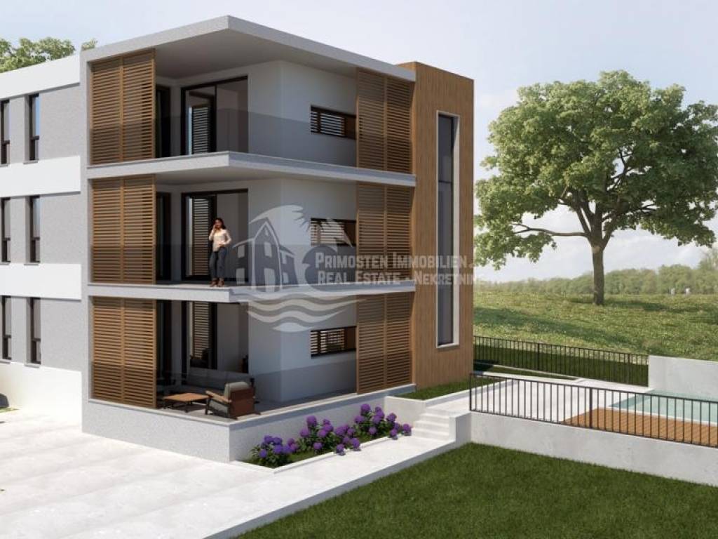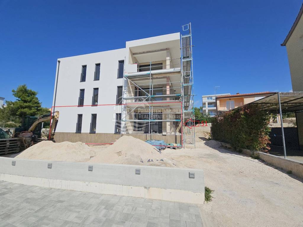 The modern new 3 room apartment in Rogoznica is located on the ground floor in a building with a total of three residential units. The building is in the final construction phase and will be ready for occupancy from February 2025. The living space is 119.80 m² plus approx. 10 m² storage room in the basement and consists of a spacious open plan kitchen-living area extended by a 19 m² balcony, three bedrooms with parquet flooring, two bathrooms, separate toilet and a swimming pool of 31,98 m². The technical equipment includes four air conditioning systems, electric underfloor heating in the bathrooms and the kitchen-living room, fly screens on the windows, a hands-free system, and a community solar system for hot water preparation for all residential units. What sets this property apart are the high-quality building materials, contemporary architecture and a modern room layout. Another important attribute is the proximity to the sea (approx. 70 m) and an illuminated coastal path (approx. 5 km) that leads to the center of Rogoznica, as well as access via a residential road. This has the advantage that you are very close to the sea and still have peace and quiet. Included in the purchase price are two free parking spaces and the aforementioned storage room in the basement. The property is ideal for tourism or as a comfortable apartment for private use. Arrange a viewing appointment now or contact us for further details!