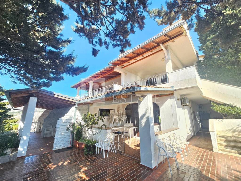 Il cortile è arricchito da piante mediterranee, due barbecue in pietra, un ampio giardino e una doccia esterna. All'interno del giardino si trova una bellissima piscina e una zona solarium con vista aperta sul mare.