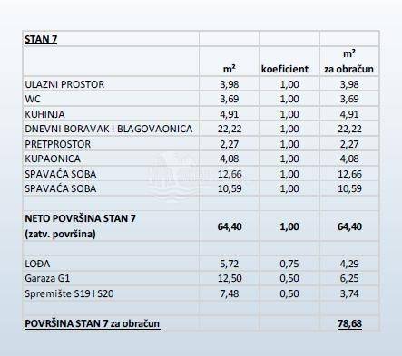For sale is apartment S7, located on the second floor of the building. The apartment has a total net usable area of ​​78.68 m2. It consists of a kitchen, living room and dining room, hallway, two bedrooms, bathroom and toilet. The living area opens onto a loggia with a sea view. Apartment S7 has two storage rooms in the basement and one garage parking space. The planned completion of construction is in summer 2026, and payment is in stages, depending on the level of construction.