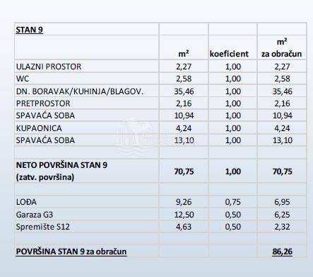 For sale is apartment S9, located on the second floor of the building. The apartment has a total net usable area of 86.26m2. It consists of a kitchen, living room and dining room, hallway, two bedrooms, bathroom and toilet. The living area opens onto a loggia with a sea view. Apartment S9 has a storage room in the basement and one garage parking space. The planned completion of construction is in summer 2026, and payment is in stages, depending on the level of construction.
