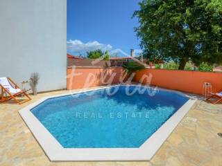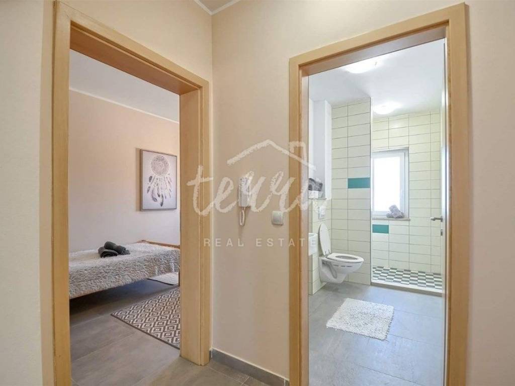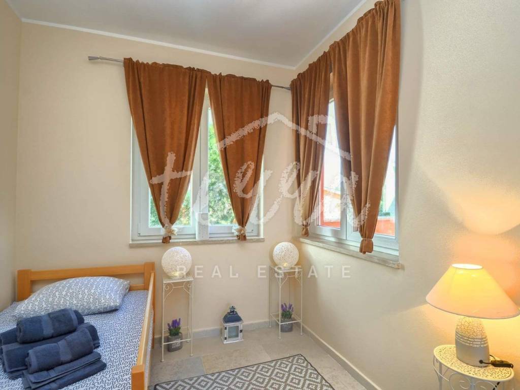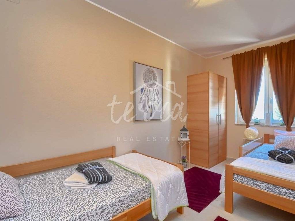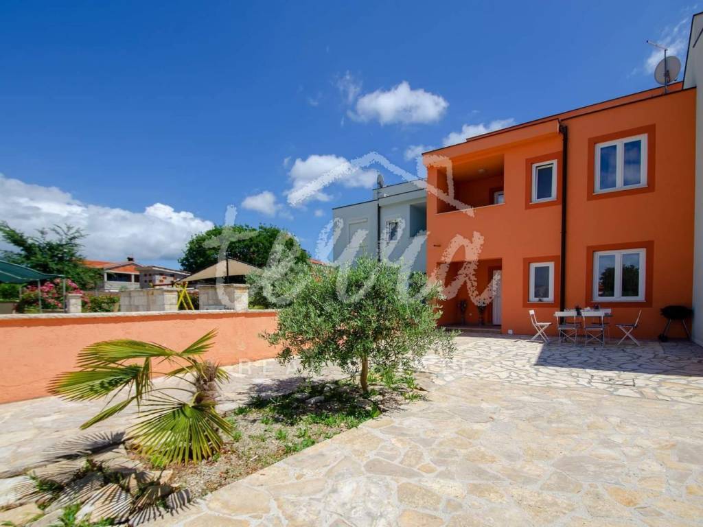 A house for sale in a row. The house is fully furnished and well-established in the rental business. The ground floor consists of a hallway, bedroom, bathroom with toilet, living room with dining room and kitchen and storage. Through the ground floor of the house there is an exit to the terrace and pool. On the first floor there are three bedrooms, a bathroom and two terraces. The house has air conditioning for heating and cooling. In the living room and kitchen there is a 12V underfloor heating. The house has PVC joinery. Suitable as an investment in tourism (established rental business).