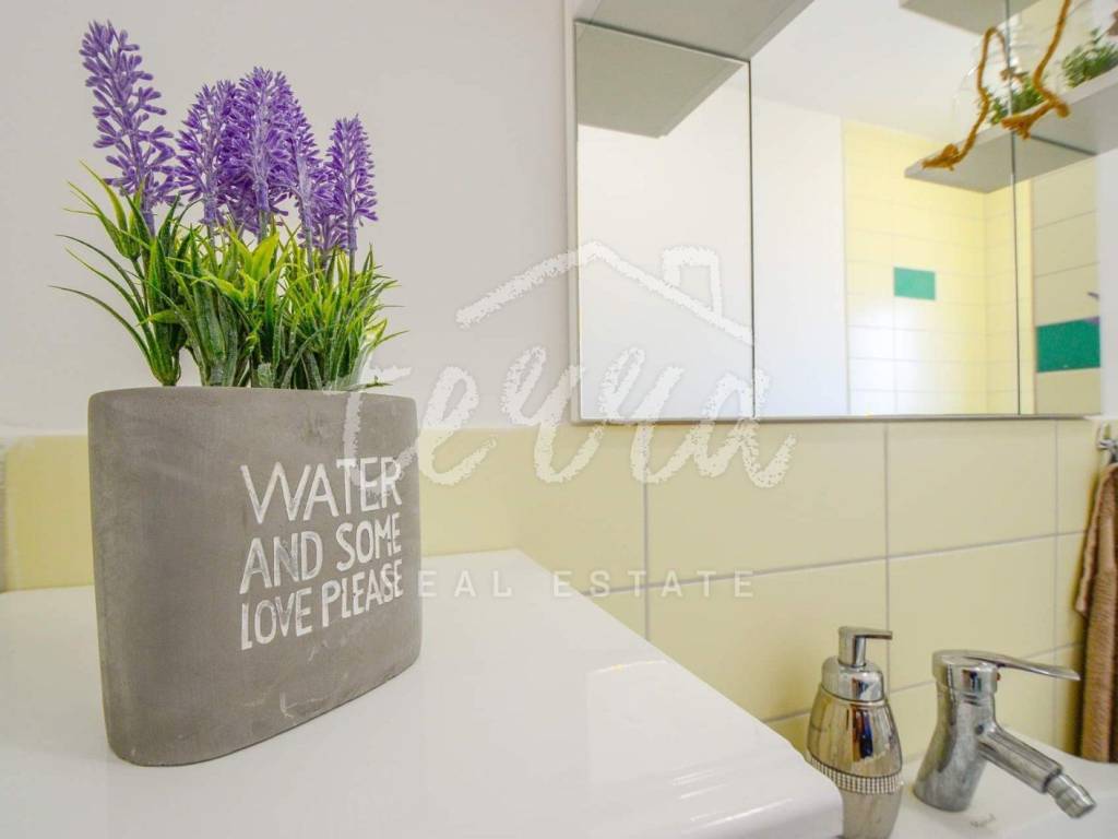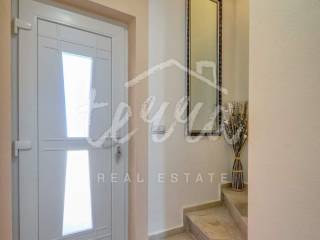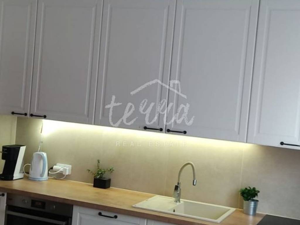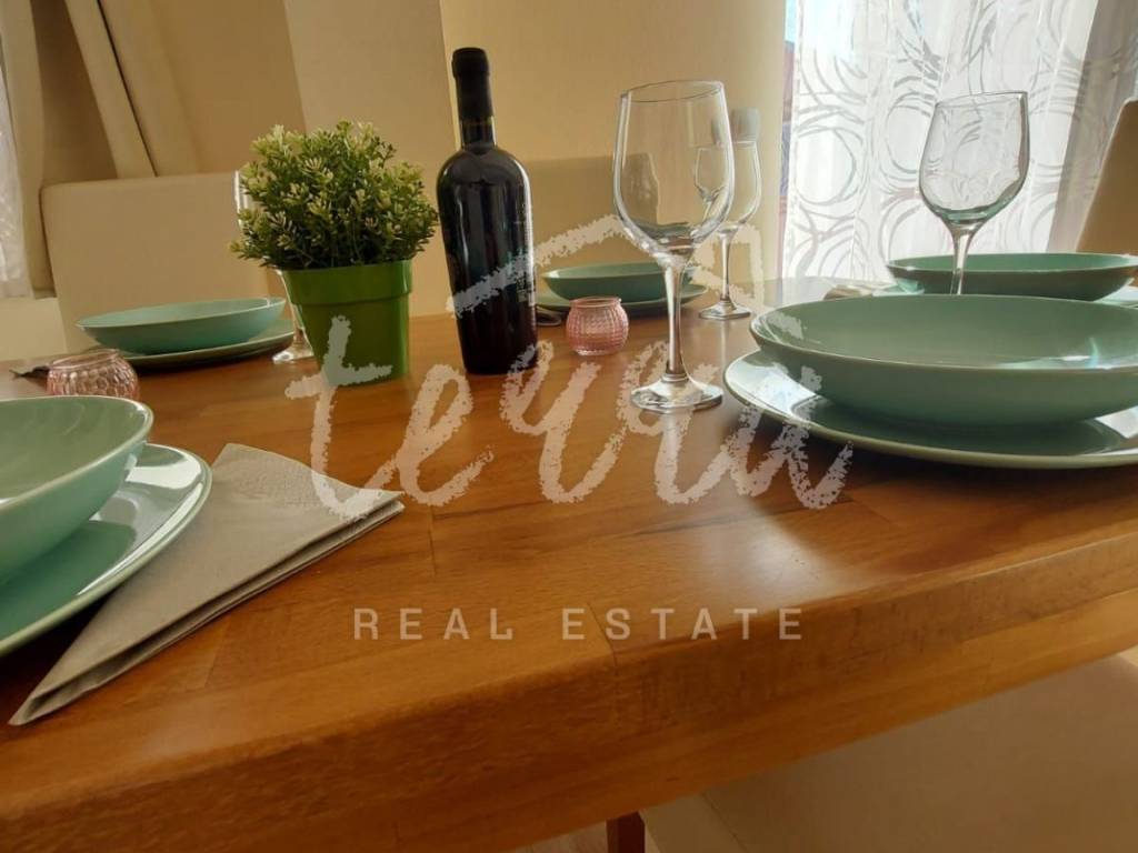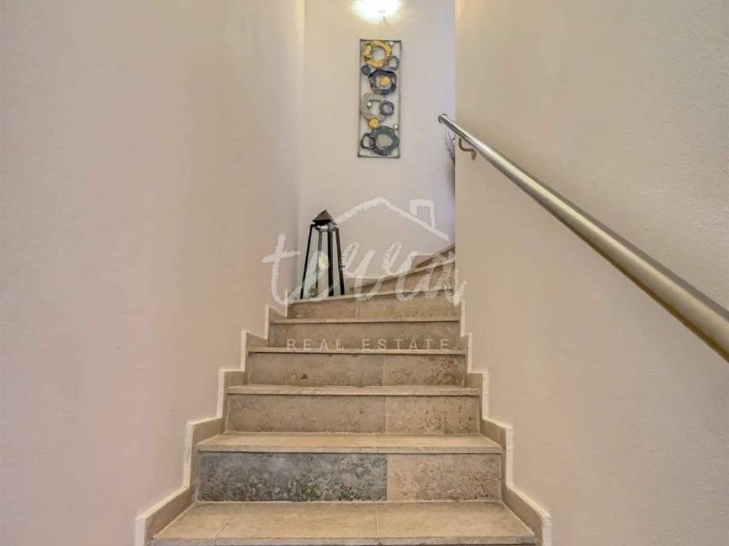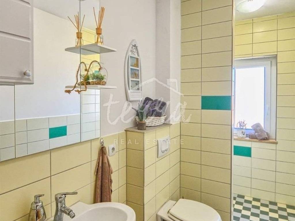 A house for sale in a row. The house is fully furnished and well-established in the rental business. The ground floor consists of a hallway, bedroom, bathroom with toilet, living room with dining room and kitchen and storage. Through the ground floor of the house there is an exit to the terrace and pool. On the first floor there are three bedrooms, a bathroom and two terraces. The house has air conditioning for heating and cooling. In the living room and kitchen there is a 12V underfloor heating. The house has PVC joinery. Suitable as an investment in tourism (established rental business).