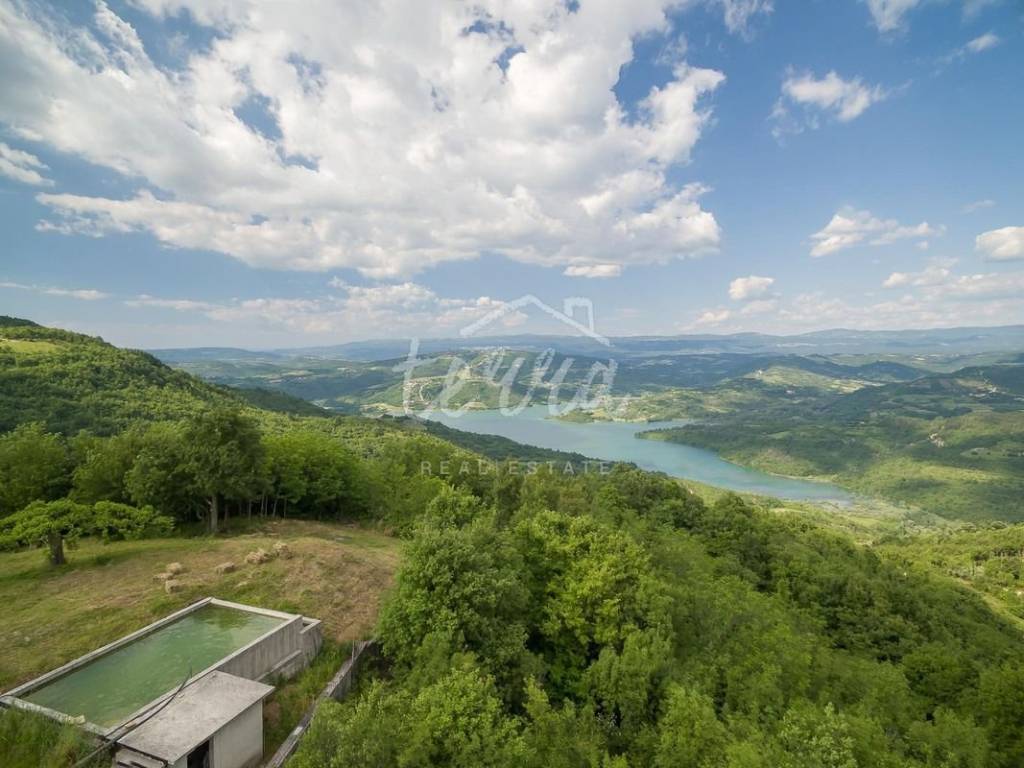 Projekt s dozvolom sastoji se od buduće moderne kuće veličine 400 m2 s vanjskim preljevnim bazenom, izgrađene wellness kuće cca 120 m2 s predviđenim unutarnjim grijanim bazenom s protustrujnim plivanjem, sauna, teretana te sobe s zabavnim aparatima i kuće s 3 sobe i kuhinjom, također izgrađena, predviđena za goste ili uslužno osoblje. Zemljište je površine 3800 m2, s prekrasnim pogledom na jezero s potpunom privatnošću. Plaćeni komunalni doprinosi, mogućnost izgradnje odmah.