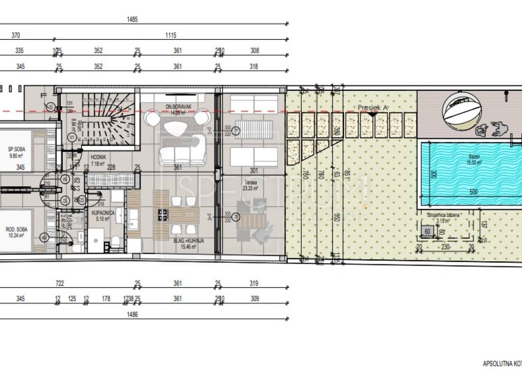L'appartamento si trova al piano terra di un edificio residenziale di nuova costruzione. La superficie abitabile è di 64,23 m2. L'appartamento è composto da un soggiorno con cucina open space e zona pranzo, 2 camere da letto, 2 bagni e un corridoio. Il soggiorno si apre su un'ampia terrazza di 23,23 m2. Dalla terrazza si accede alla piscina di 15 m². La piscina con area solarium è lo spazio ideale per godersi i caldi mesi estivi. L'appartamento dispone inoltre di un cortile recintato di 139 m2.